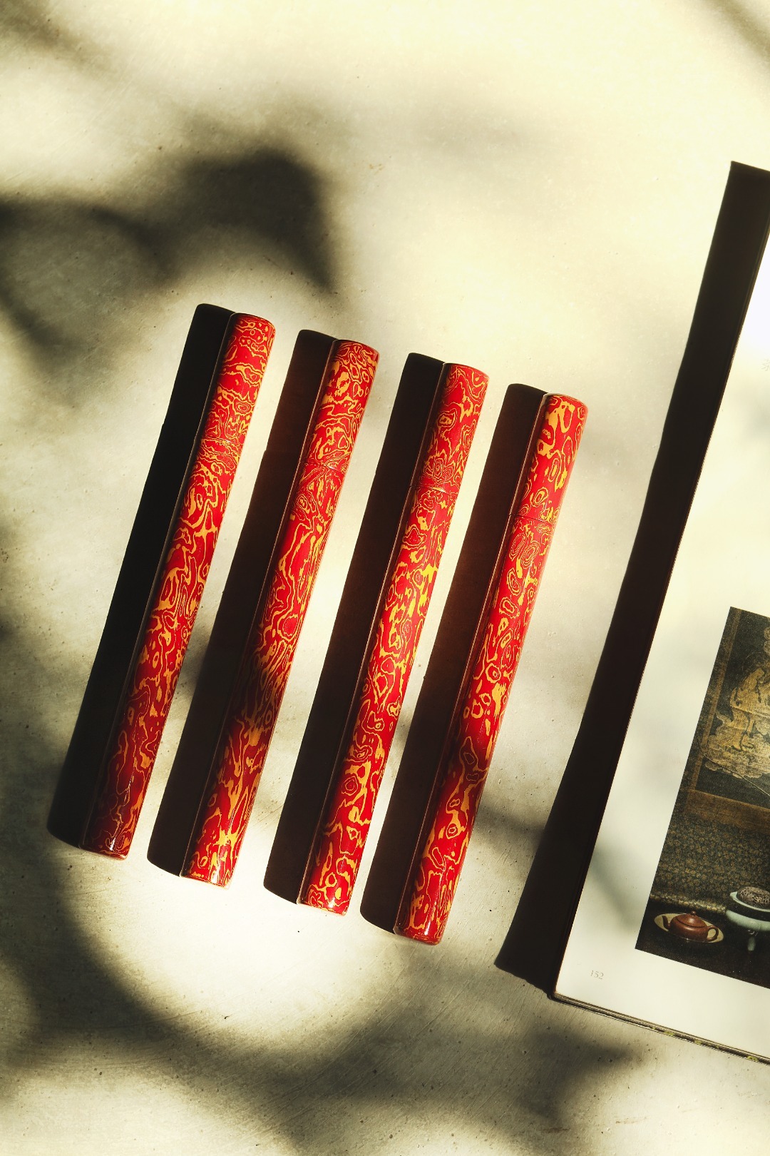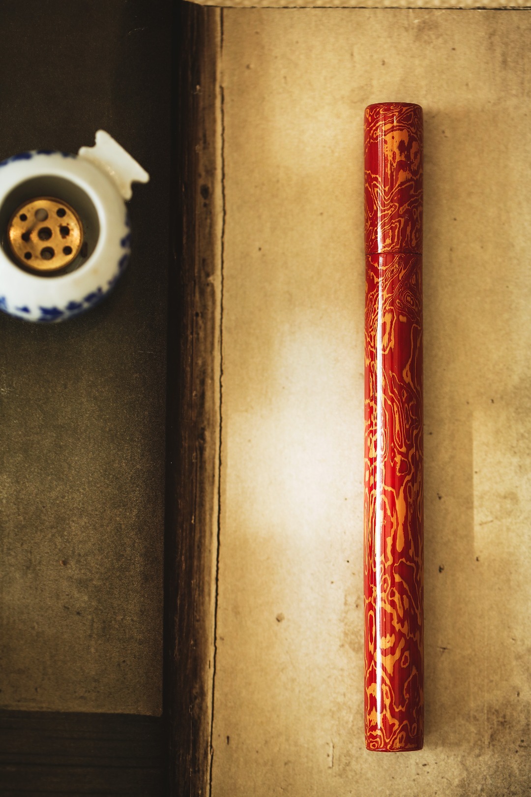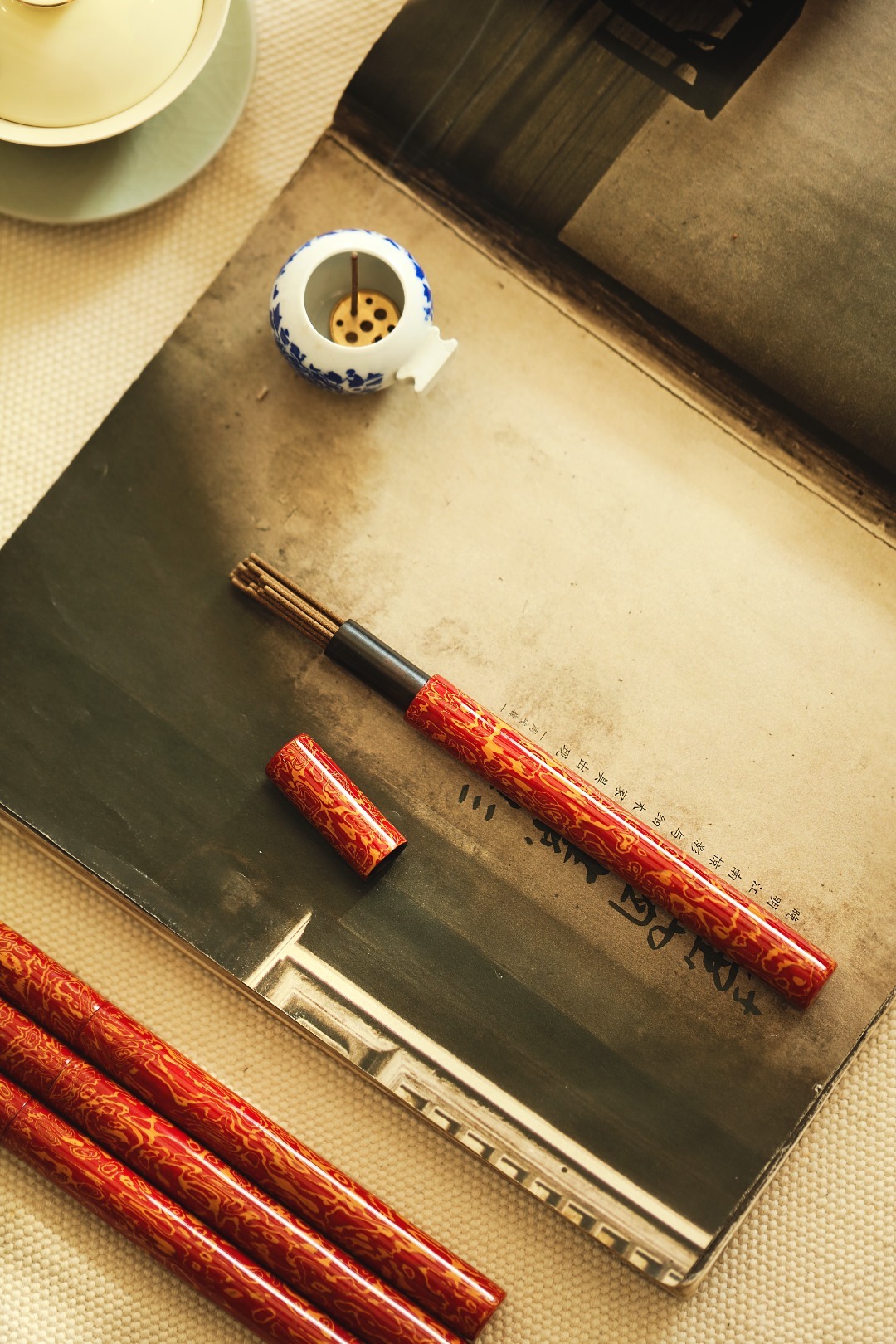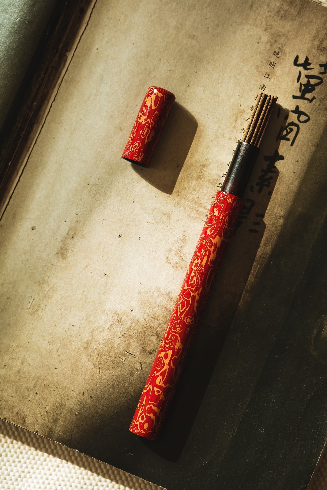大漆【红金】香筒紫光檀为胎,髹漆其上,色华质坚历久弥新,明艳夺目,清雅的颜色、温润的色泽也是室内手边称手雅器,点一根香,把喧嚣留给世外,静谧舒心。直径1.5cm 长17cm 大漆【红金】香筒