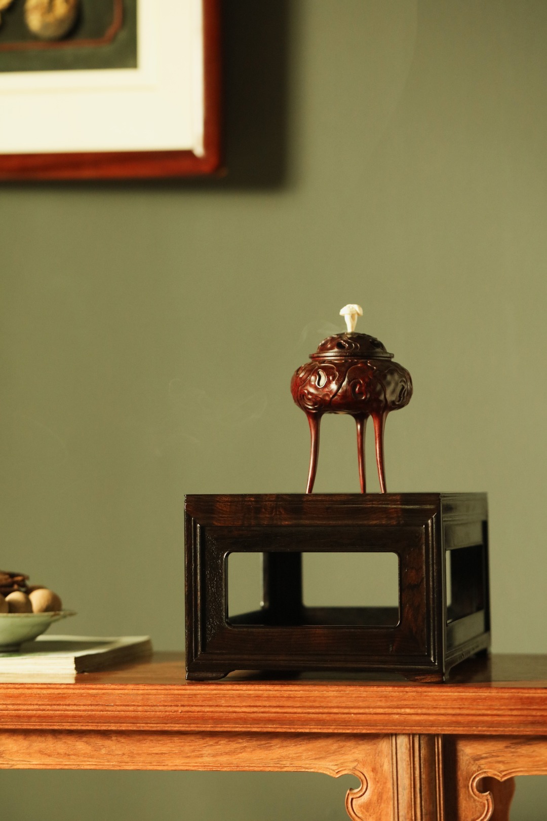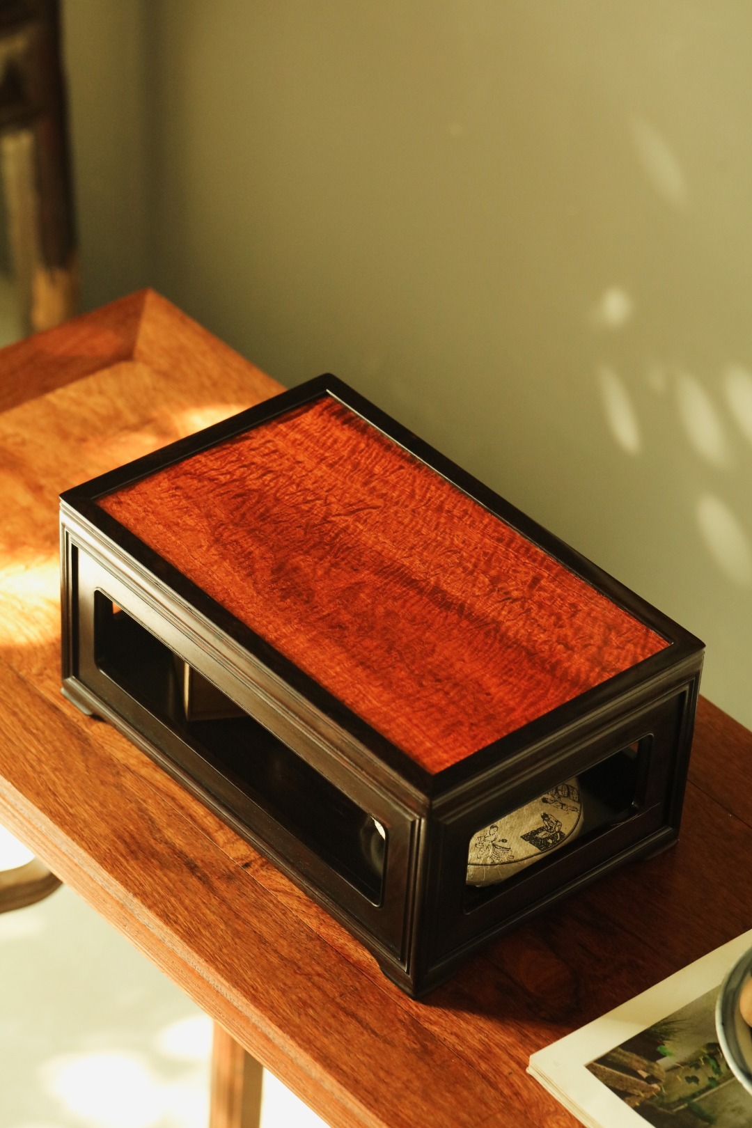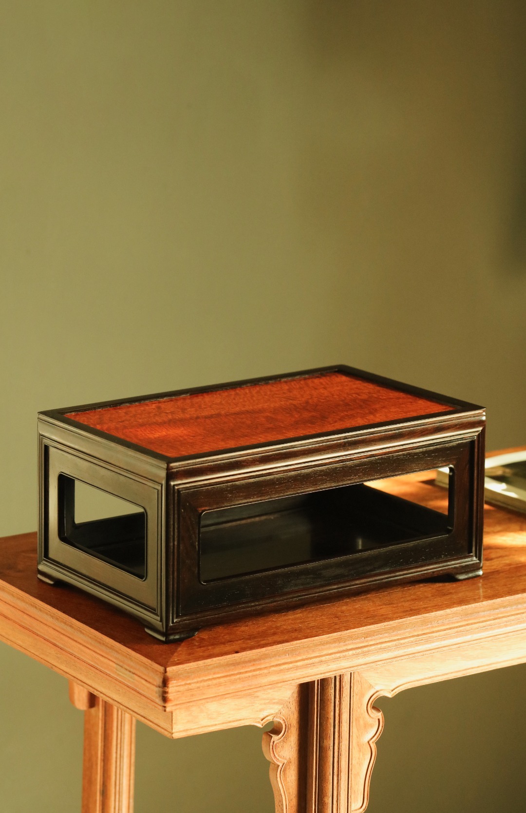 紫光檀x缅花【扶风】香几紫光檀撞色缅花,几面精挑爆满水波料,造型方整光素,四平面,双层收纳,可承盆石清供,炉鼎茗烟,美观实用。30.5*19.5*13.8cm 重1785g 紫光檀x缅花【扶风】香几