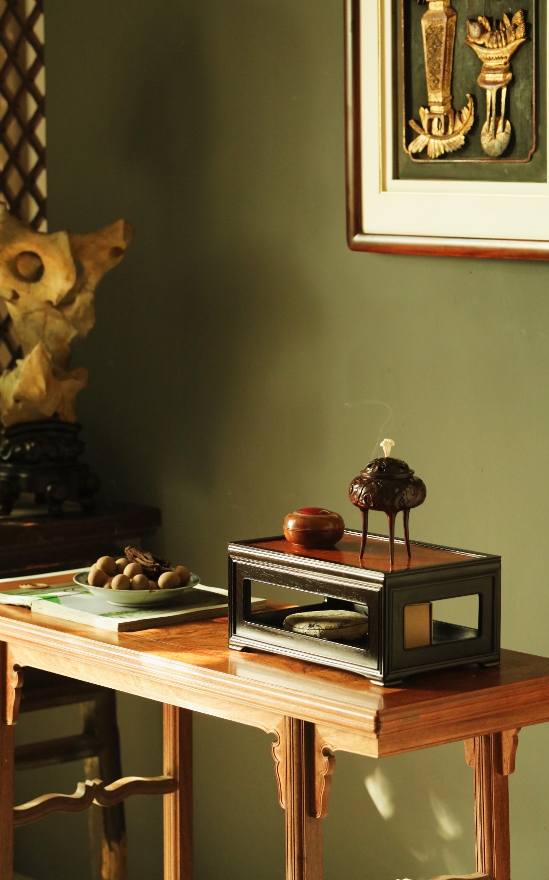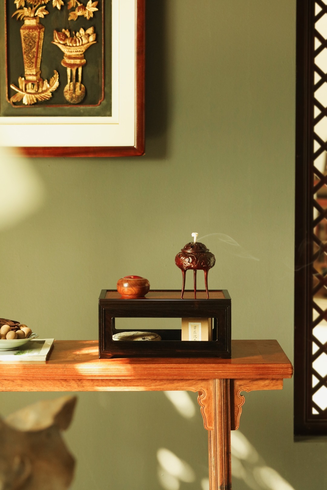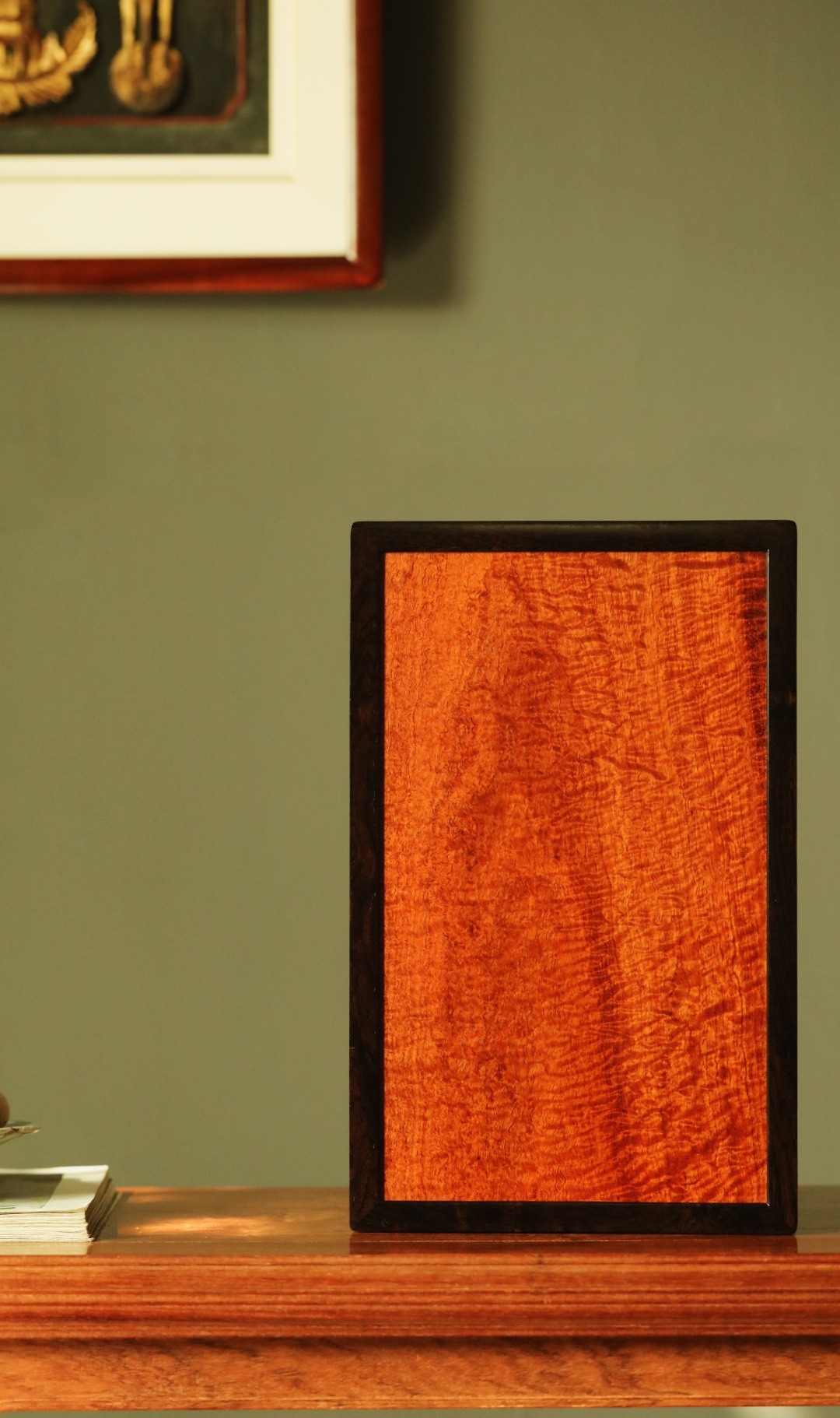 紫光檀x缅花【扶风】香几紫光檀撞色缅花,几面精挑爆满水波料,造型方整光素,四平面,双层收纳,可承盆石清供,炉鼎茗烟,美观实用。30.5*19.5*13.8cm 重1785g 紫光檀x缅花【扶风】香几
