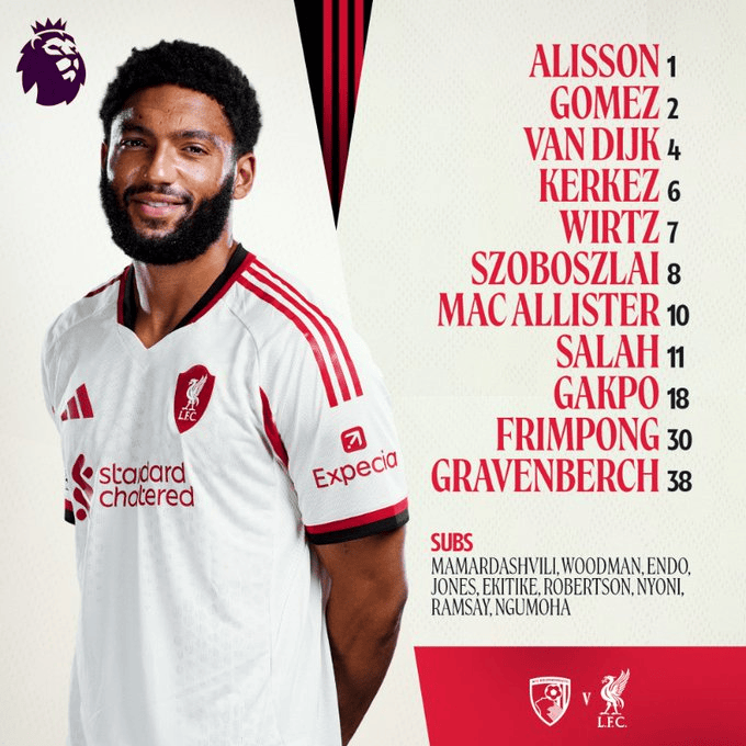 利物浦首发:1-阿利松、30-弗林蓬、2-乔-戈麦斯、4-范戴克、6-科尔克兹、38-赫拉芬贝赫、10-麦卡利斯特、8-索博斯洛伊、7-维尔茨、18-加克波、11-萨拉赫