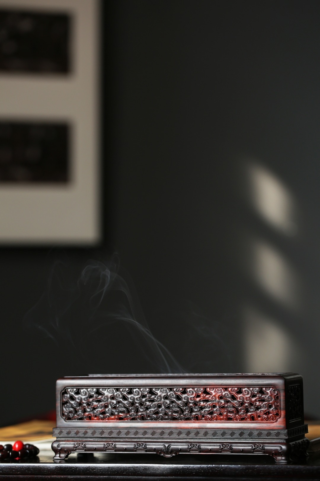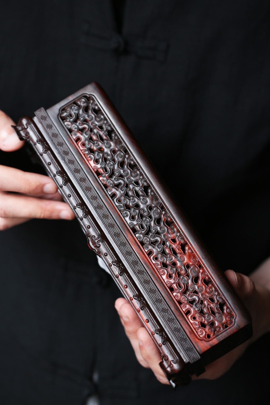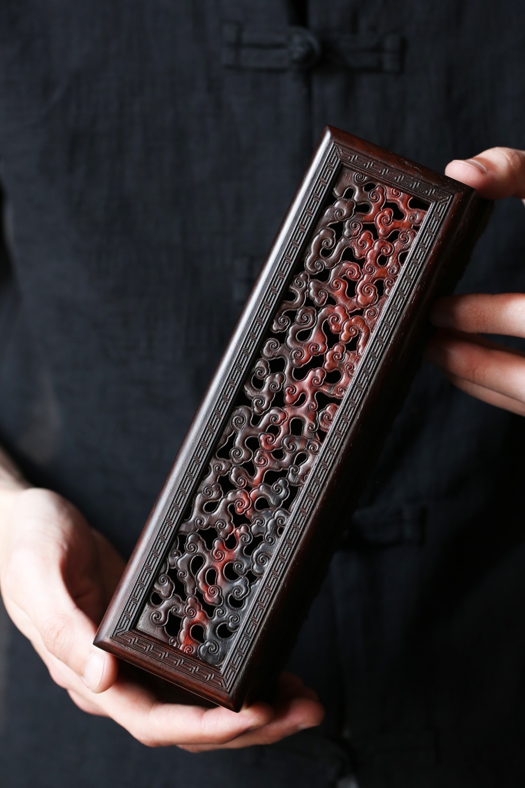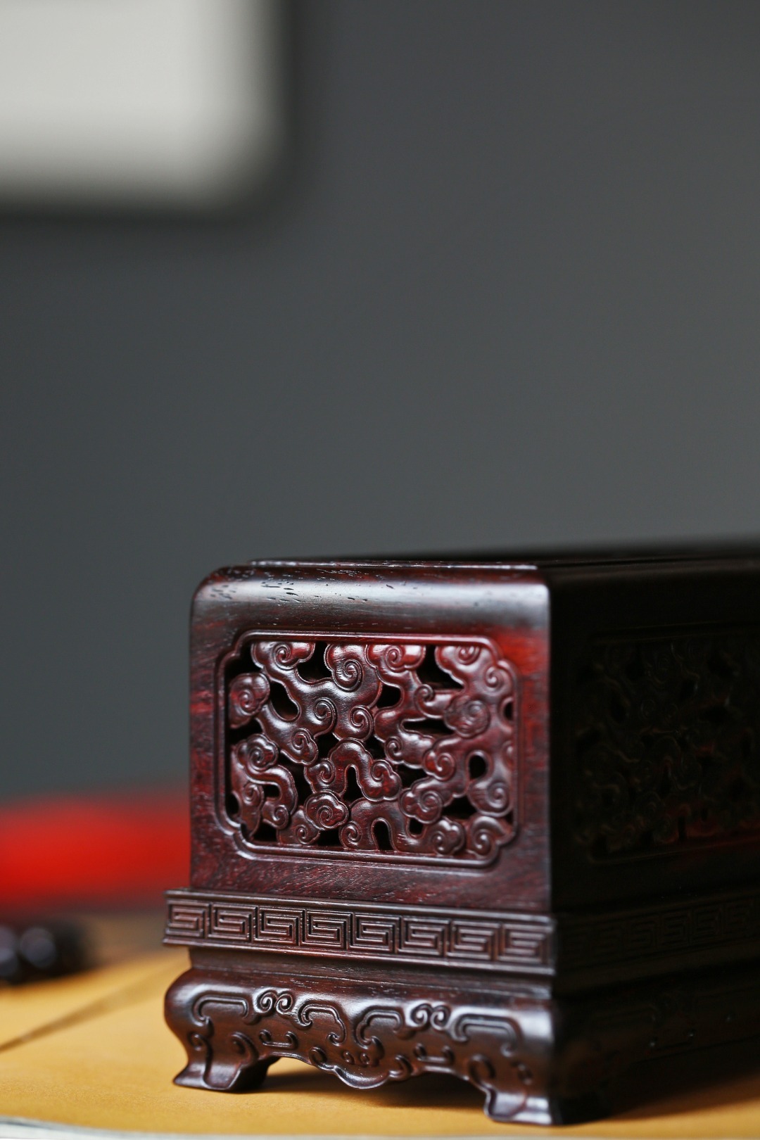 大红酸枝『祥云·卧香炉』大红酸枝黑飘红老料制,香盒周身镂空雕刻祥云纹,层层叠叠,祥云漫天,烟香从壁孔袅袅而出,氤氲朦胧似仙境。摆放文房案头,古韵古香。23.5*7.5*8cm 重350g 大红酸枝『祥云·卧香炉』