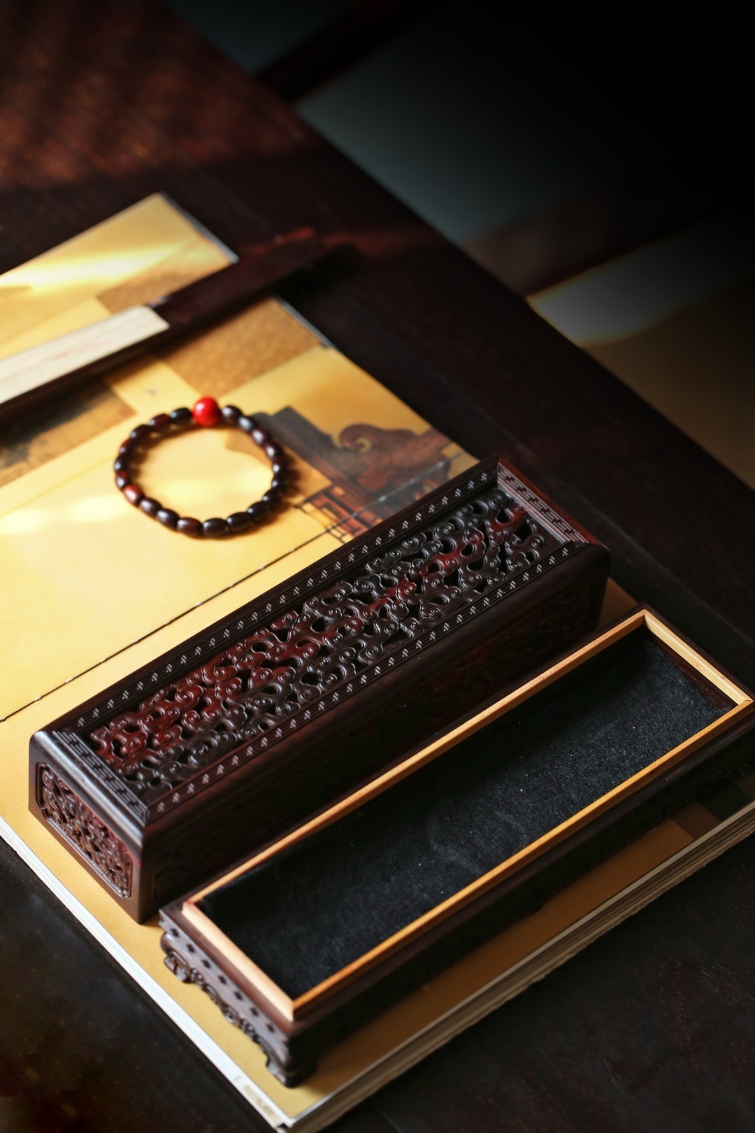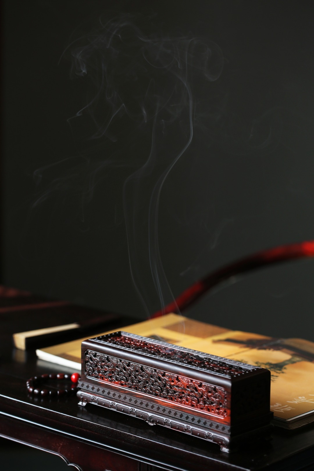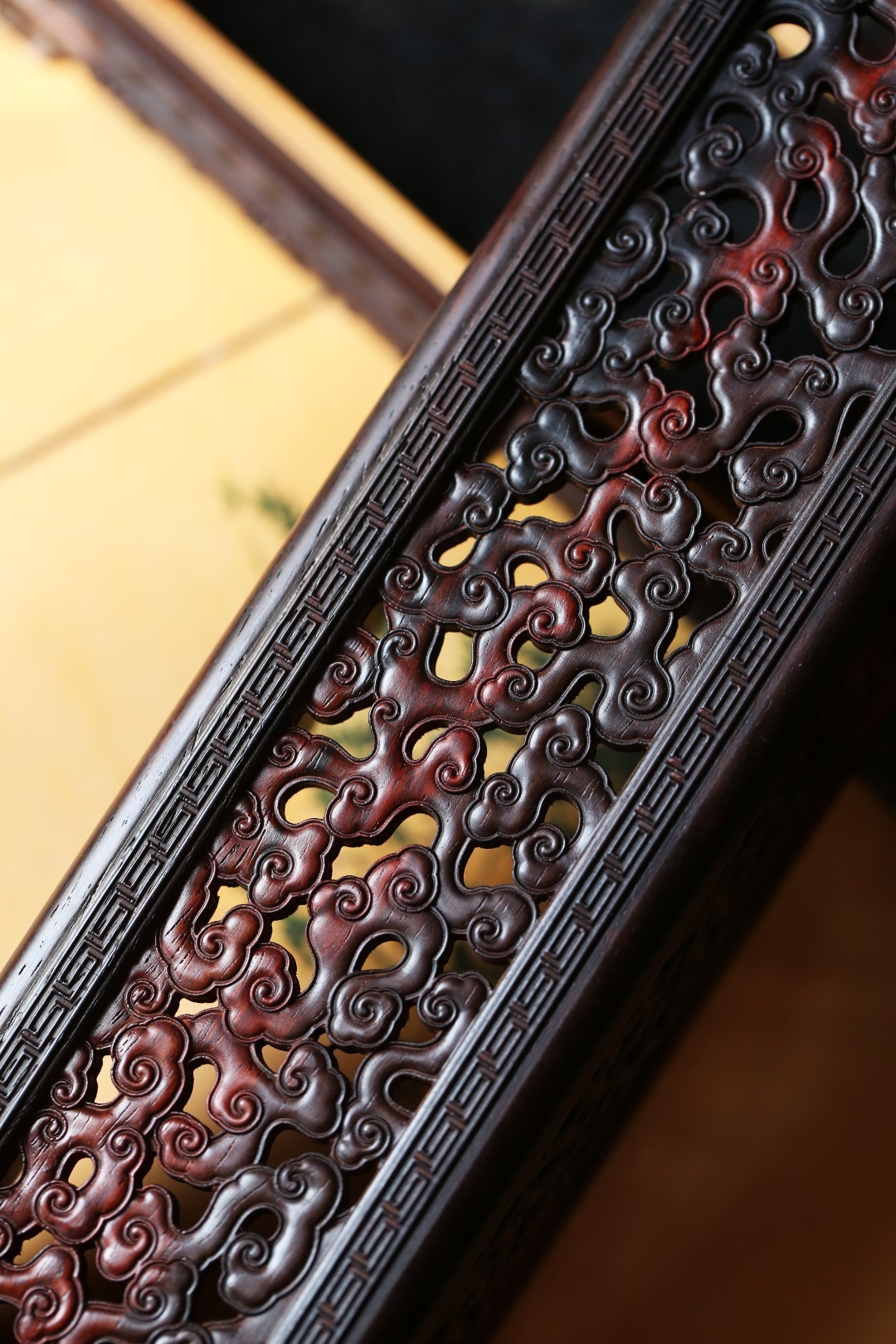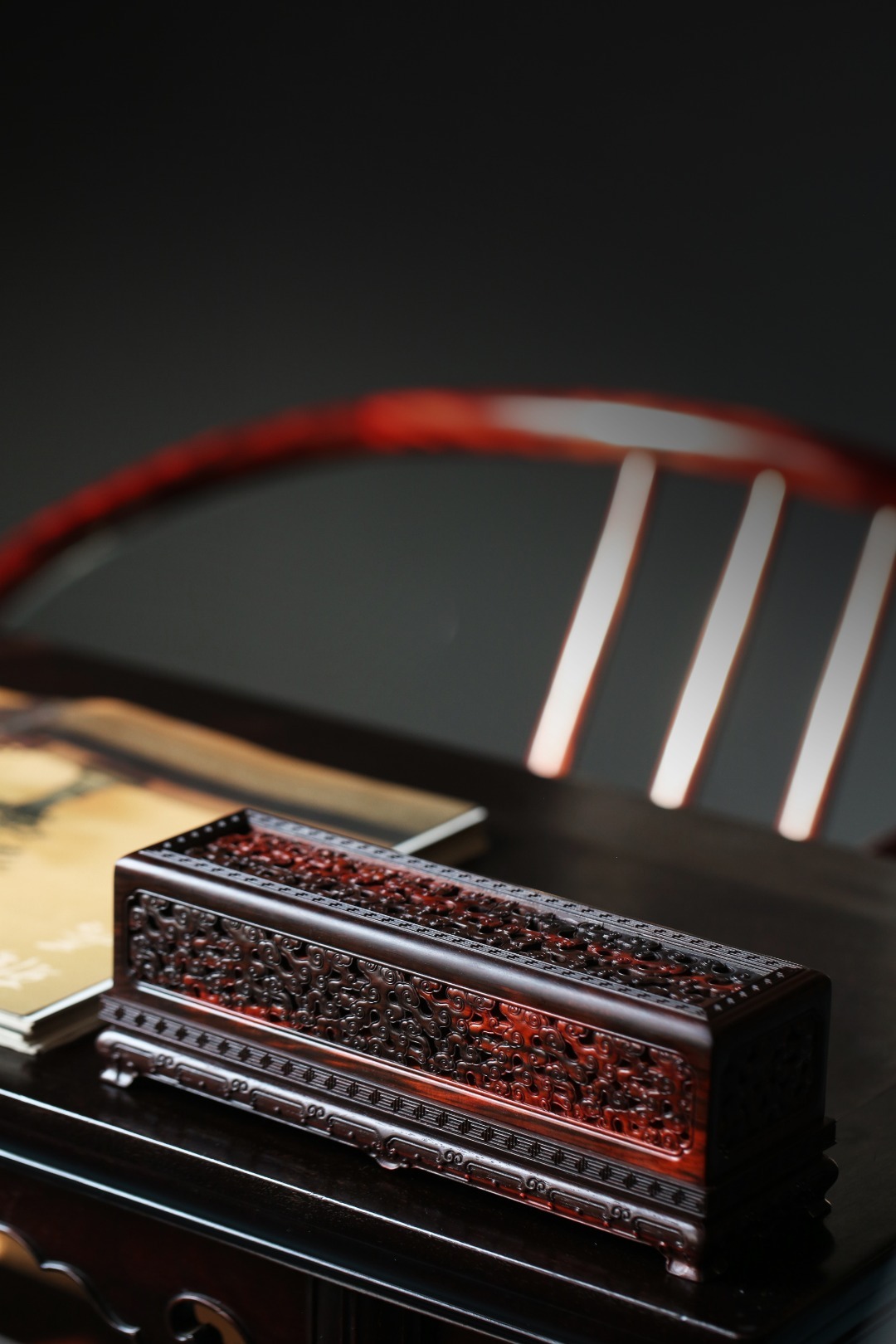 大红酸枝『祥云·卧香炉』大红酸枝黑飘红老料制,香盒周身镂空雕刻祥云纹,层层叠叠,祥云漫天,烟香从壁孔袅袅而出,氤氲朦胧似仙境。摆放文房案头,古韵古香。23.5*7.5*8cm 重350g 大红酸枝『祥云·卧香炉』