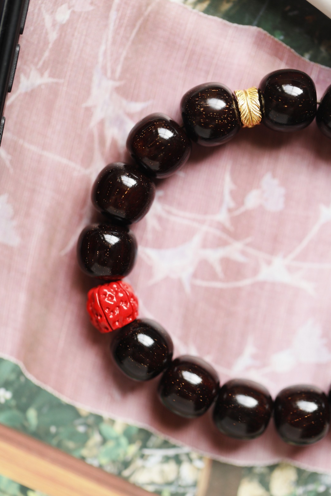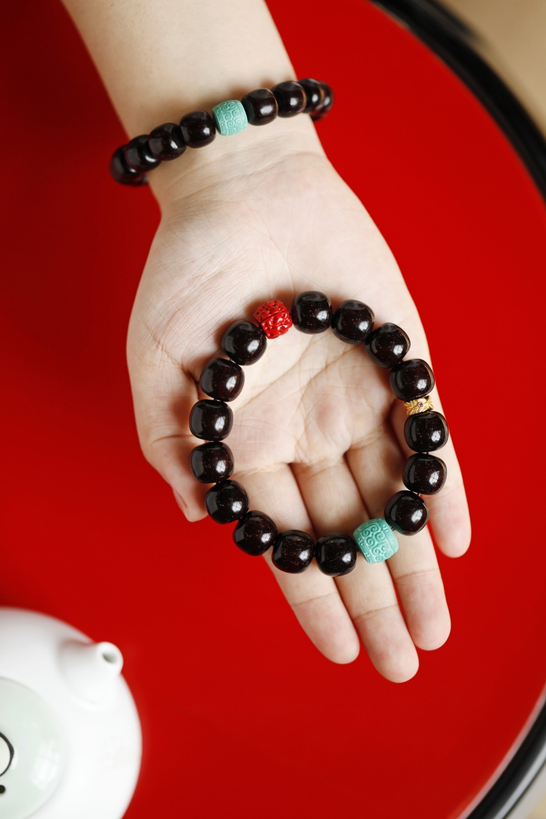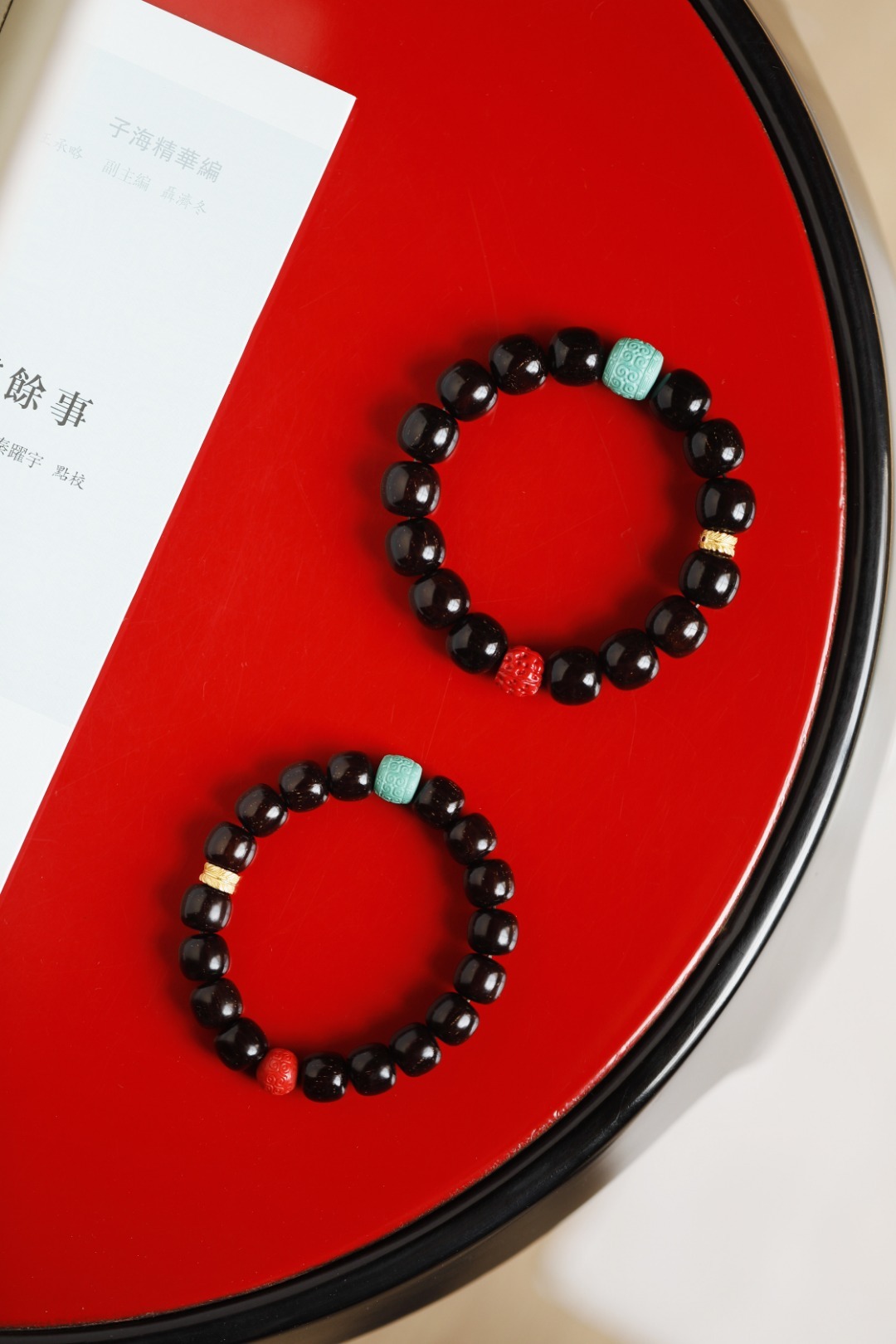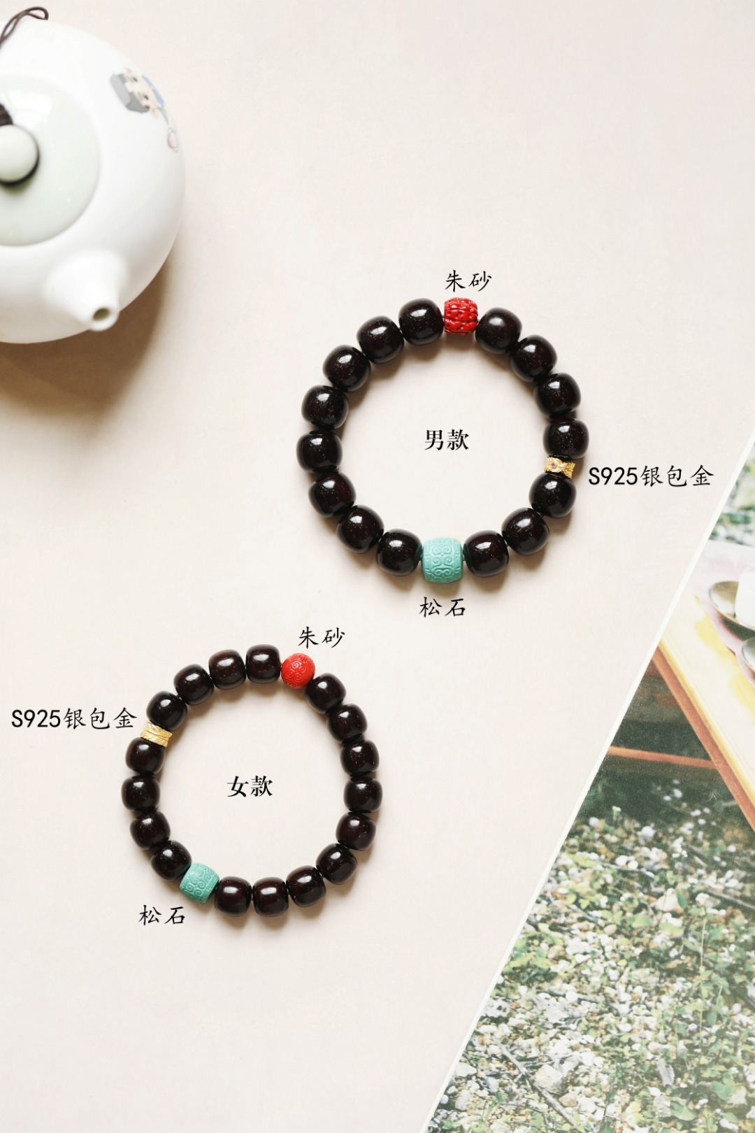 小叶紫檀 原创 情侣款【清瑜】以紫檀为主珠,色润质坚;搭配多种玉石,自然灿烂,温润典雅复古,别致国风。配件:s925银包金、松石、朱砂男款:12x13mm 15颗 女款:10x11mm 17颗 小叶紫檀 原创 情侣款【清瑜】