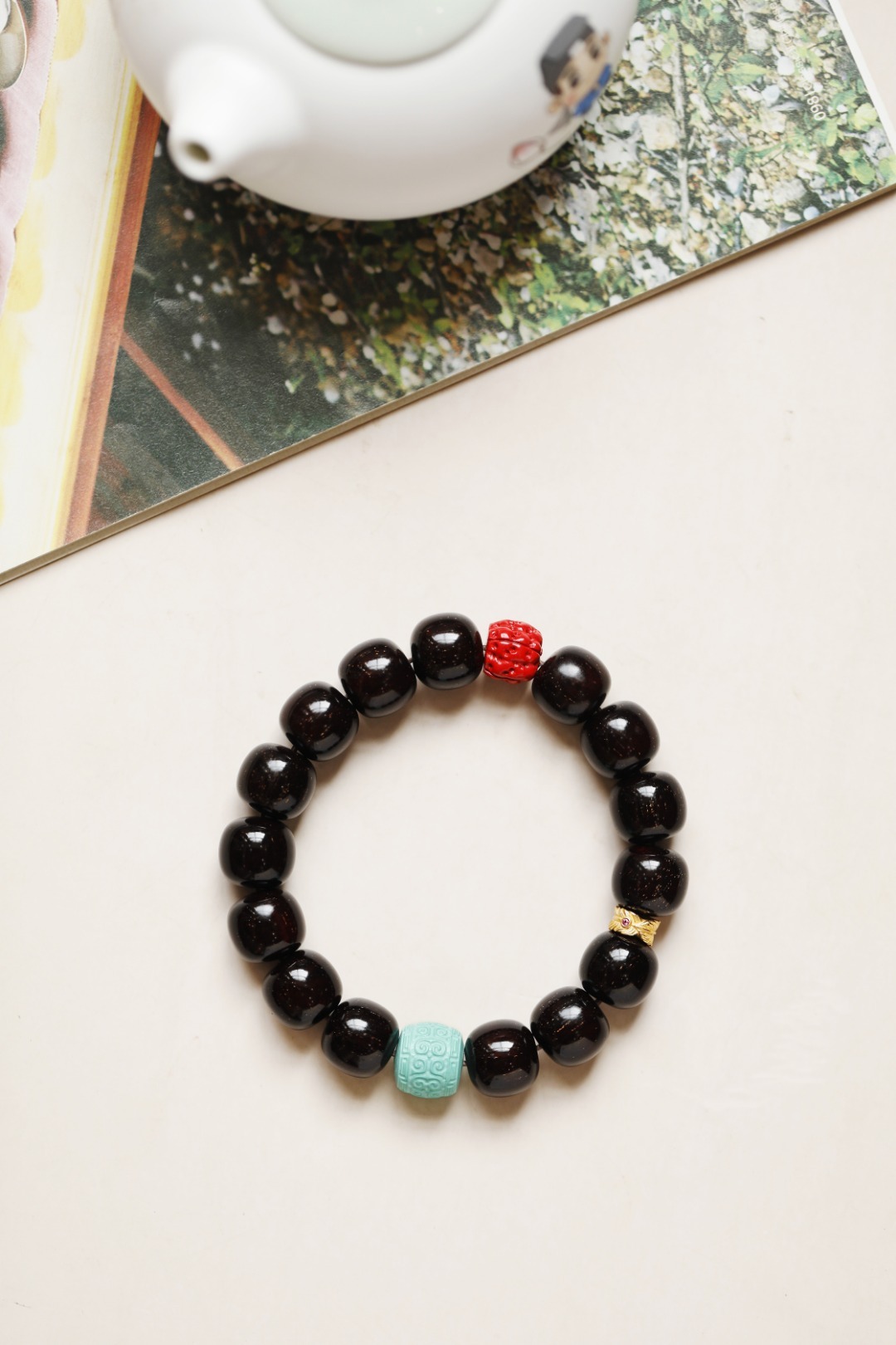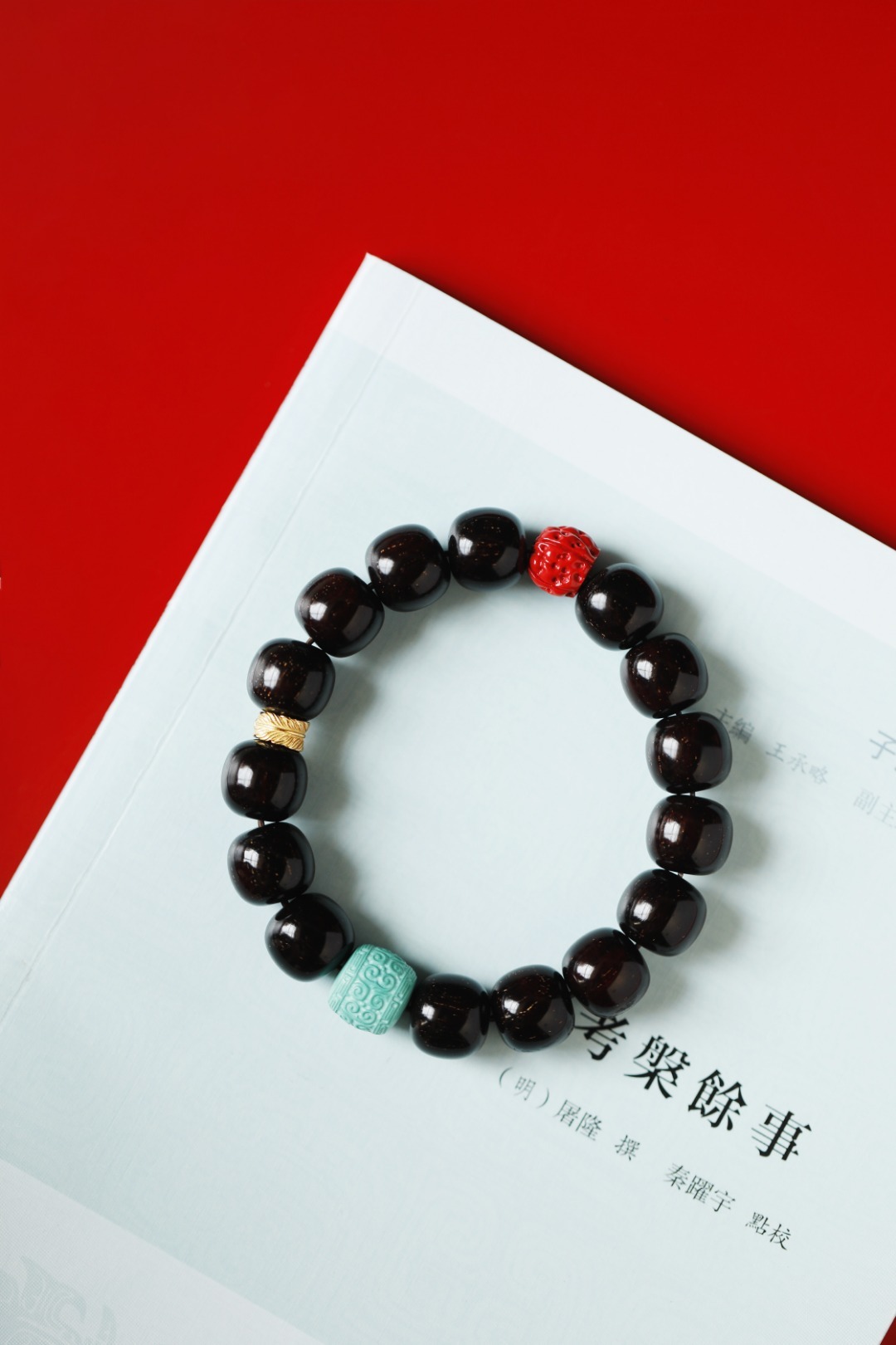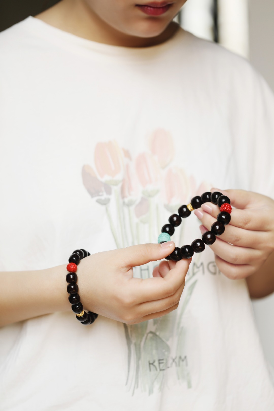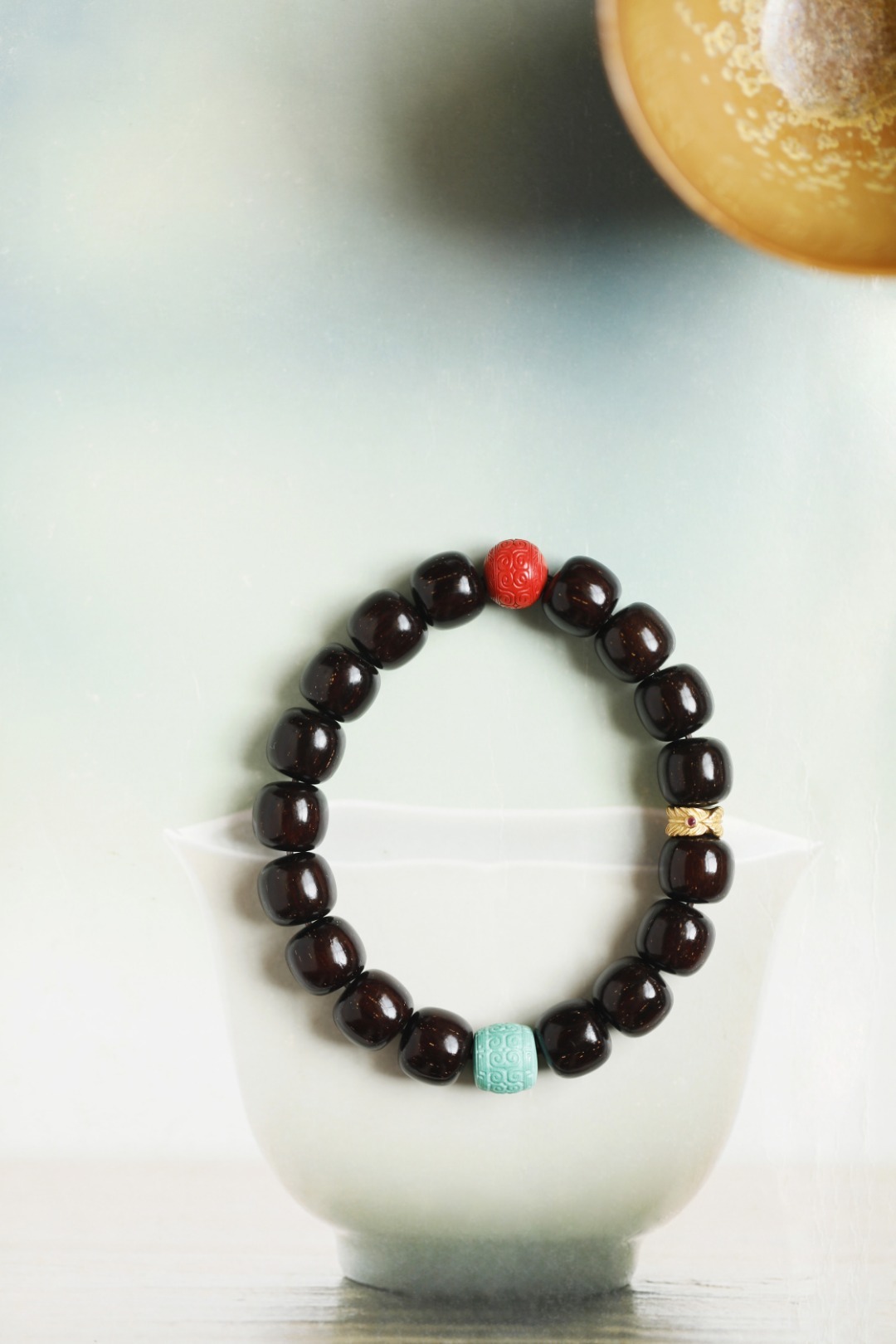 小叶紫檀 原创 情侣款【清瑜】以紫檀为主珠,色润质坚;搭配多种玉石,自然灿烂,温润典雅复古,别致国风。配件:s925银包金、松石、朱砂男款:12x13mm 15颗 女款:10x11mm 17颗 小叶紫檀 原创 情侣款【清瑜】