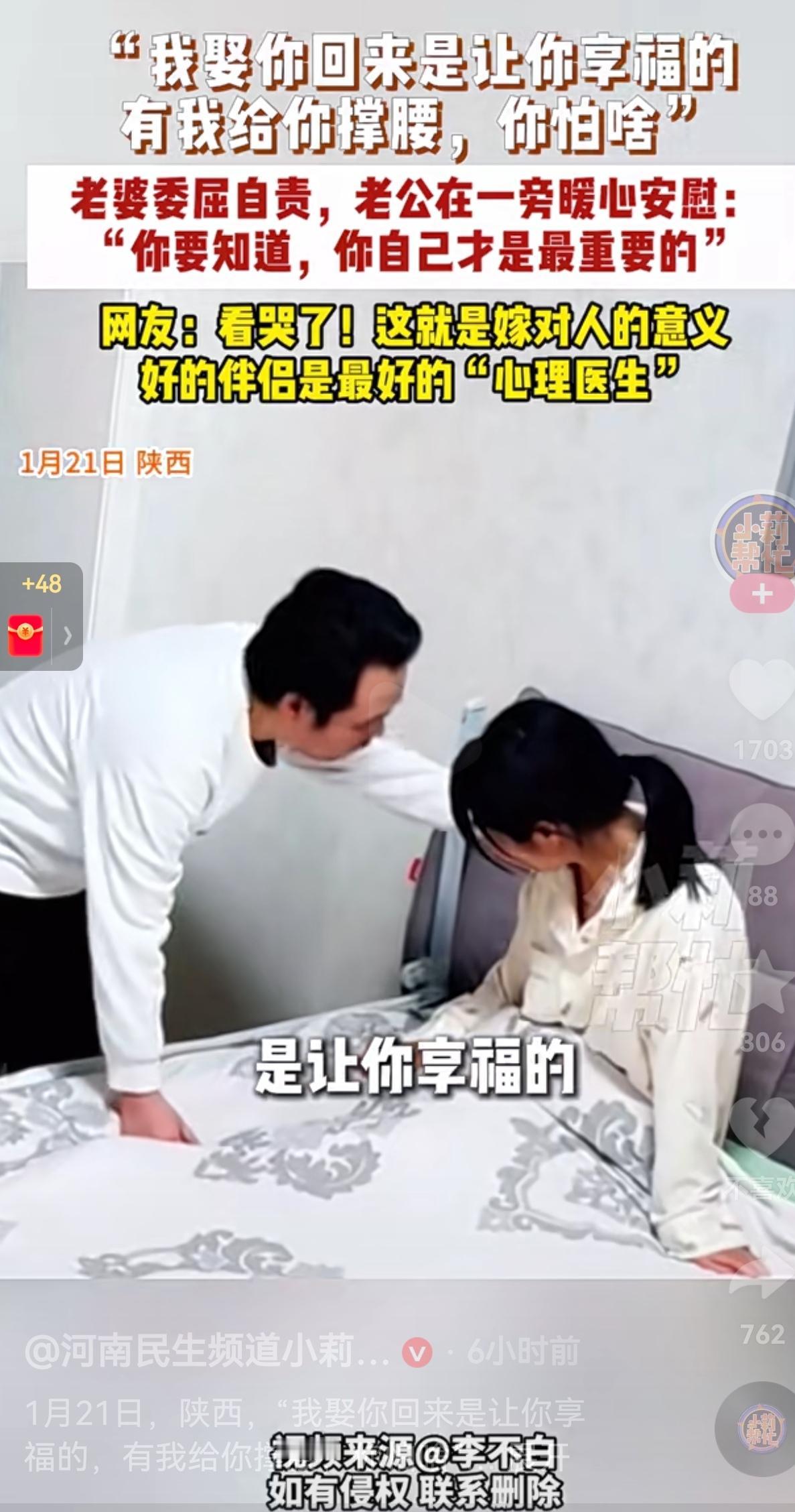 丈夫的这一番话,听得人心里暖暖的!原来嫁对人,真的能把你宠成一辈子的小女孩。 陕西,一女子因为生活琐事委屈自责,坐在床边默默掉眼泪。 她的丈夫下班后,看到妻子的情绪低落,他没有一丝不耐烦,也没有跟她讲大道理,而是站在妻子的旁边,安抚着妻子的情绪,温柔的说:“我娶你回来不是让你受气的,是让你享福的。不挣钱又怎么了?家务缠身又怎么了?我的钱就是你的钱,你想怎么花就怎么花,不用跟我说,更不用抠抠搜搜委屈自己。这活不是你一个人的,我下班给你分担,孩子我带,碗我洗。” 他还坚定地告诉妻子:“这个家的事就是咱俩说了算,还有那些不尊重你的人,不管是亲戚还是谁,有我给你撑腰,你怕啥?你别总憋着委屈自己,你要知道,你自己才是最重要的。”  网友听到男子的宠妻发言,纷纷评论道:“这就是嫁对人的意义!好的伴侣真的是最好的心理医生。” 也有的网友说: “我要是有这样的老公,受多大委屈都值了!” 说实话,这个丈夫做得很好,情绪价值拉满,面对妻子的哭泣,他没有指责妻子矫情,也没有说“这点小事至于吗”,而是用行动告诉她:无论发生什么,你身边都有我,我都会护着你。 其实,好的婚姻,就是这样:你在闹,他在笑。你累了,他给你依靠。你受委屈了,他能义无反顾地站在你身边给你撑腰。 说到底,这辈子能嫁给一个把你当孩子疼的人,你真的赚翻了,也是女人最正确的投资。 对此,你作何感想呢?