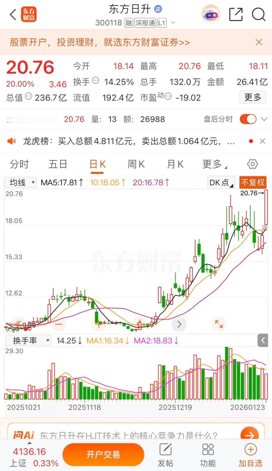马斯克力挺太空光伏,隆基绿能,东方日升那个是龙头隆基绿能涨停板收盘报收19.35元每股,成交金额93.94亿元。挺多在一个半板。东方日升涨停板收盘报收20.76元每股,成交金额26.41亿元,还是这个好,名字好,市值也好 才236.7亿元,东方日升升升升,500亿市值有望冲击。隆基绿能绿绿绿,不好,东方日升升这次估计上到30元每股。