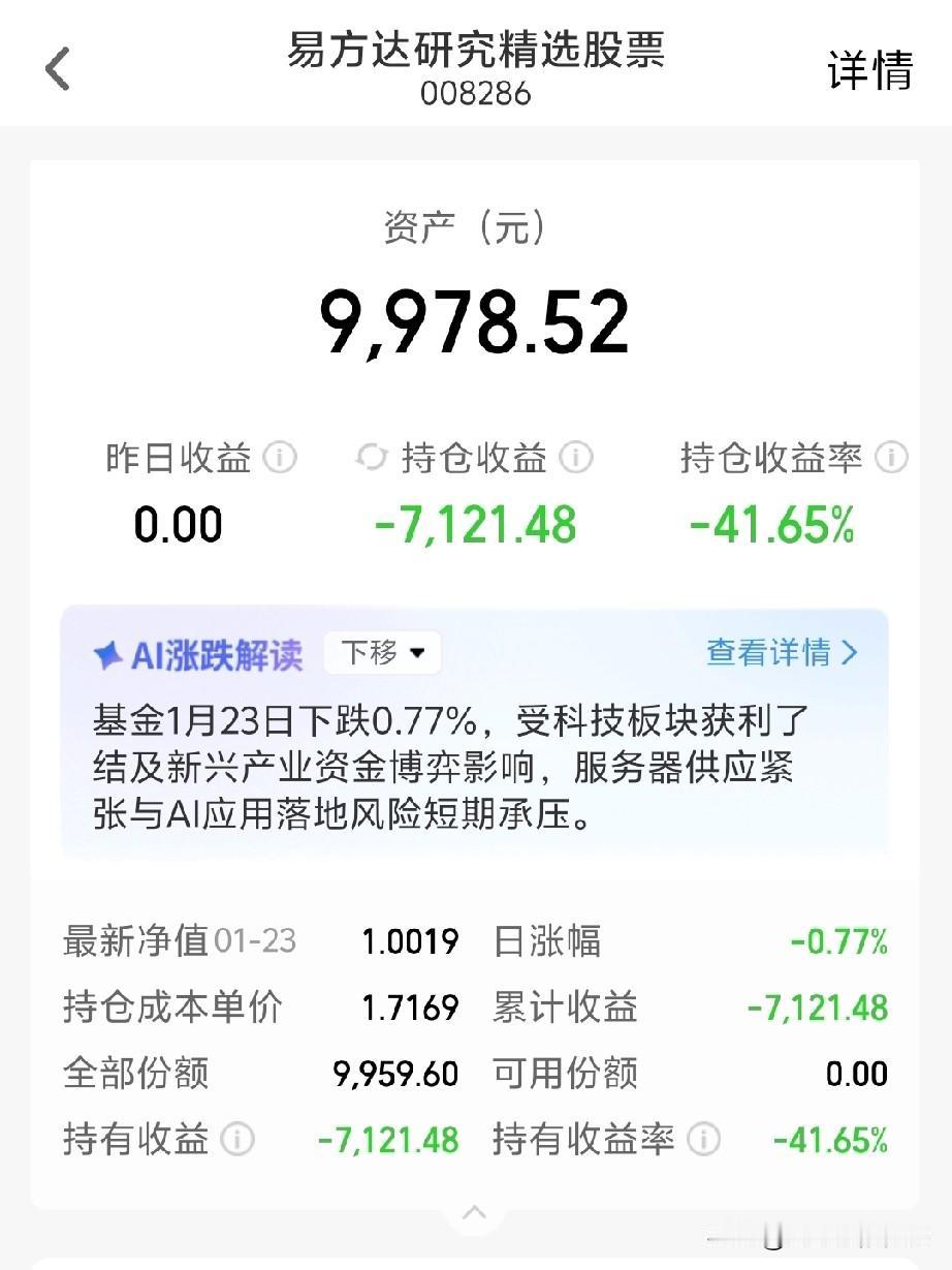 投资基金有像我这样惨的吗? 2021年分批定投的基金。 你能想象到现在还在赔钱吗? 一共四只基金。 5年过去了。 赶上了这波牛市。 可是我却像中奖了一样。 依然在赔钱。 每只基金收益率都在~40%多。 我查询了一下。 这几只基金在同类基金中均排名倒数。 我是一直持有,等着回本。 还是该卖了呀。[流泪]