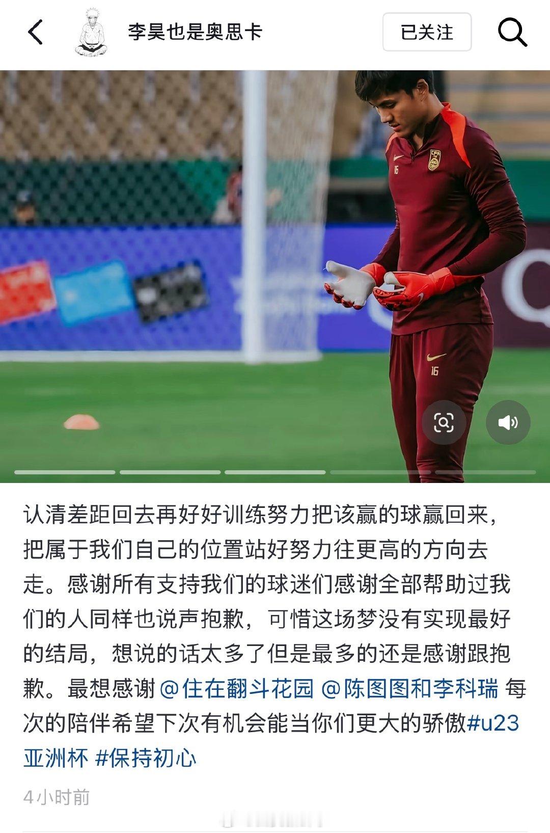 李昊回应u23国足不敌日本李昊发文回应U23国足获亚军2026亚足联U23男足亚洲杯决赛,首次闯入决赛的中国队被对手上下半场各入两球,最终0:4负于卫冕冠军日本队,获得亚军。这也是中国队在U23亚洲杯参赛历史上的最好成绩。U23男足vs日本1月25日凌晨,门将李昊发文回应此次比赛:认清差距回去再好好训练努力把该赢的球赢回来,把属于我们自己的位置站好努力往更高的方向去走。感谢所有支持我们的球迷们感谢全部帮助过我们的人同样也说声抱歉,可惜这场梦没有实现最好的结局,想说的话太多了但是最多的还是感谢跟抱歉……