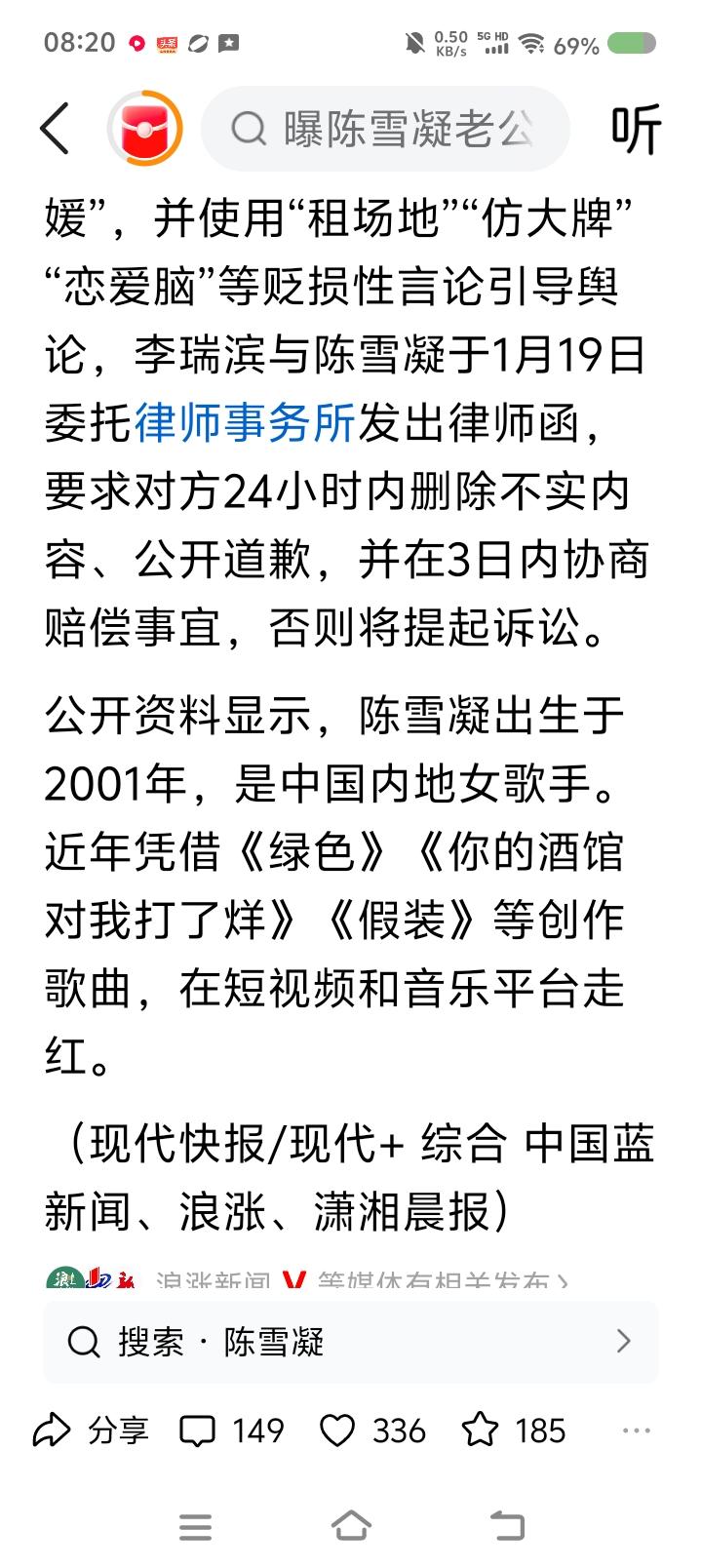 歌手陈某凝的丈夫得罪谁了?—— 据报道,歌手陈某凝的丈夫被曝领证前一天出轨。当事人尚未回应。 之前,陈某凝删除合照,引发分手猜测。陈某凝的丈夫被质疑假富二代。当事人分别表示,不信谣;发出了律师函。 点评: 为什么会有这些事? 大概两种可能:一、当事人自导自演,炒作;二、有公司或个人针对他俩,动机不良。第一种料不至于。 建议当事人采取法律手段,维护自身名誉,净化网络空气。