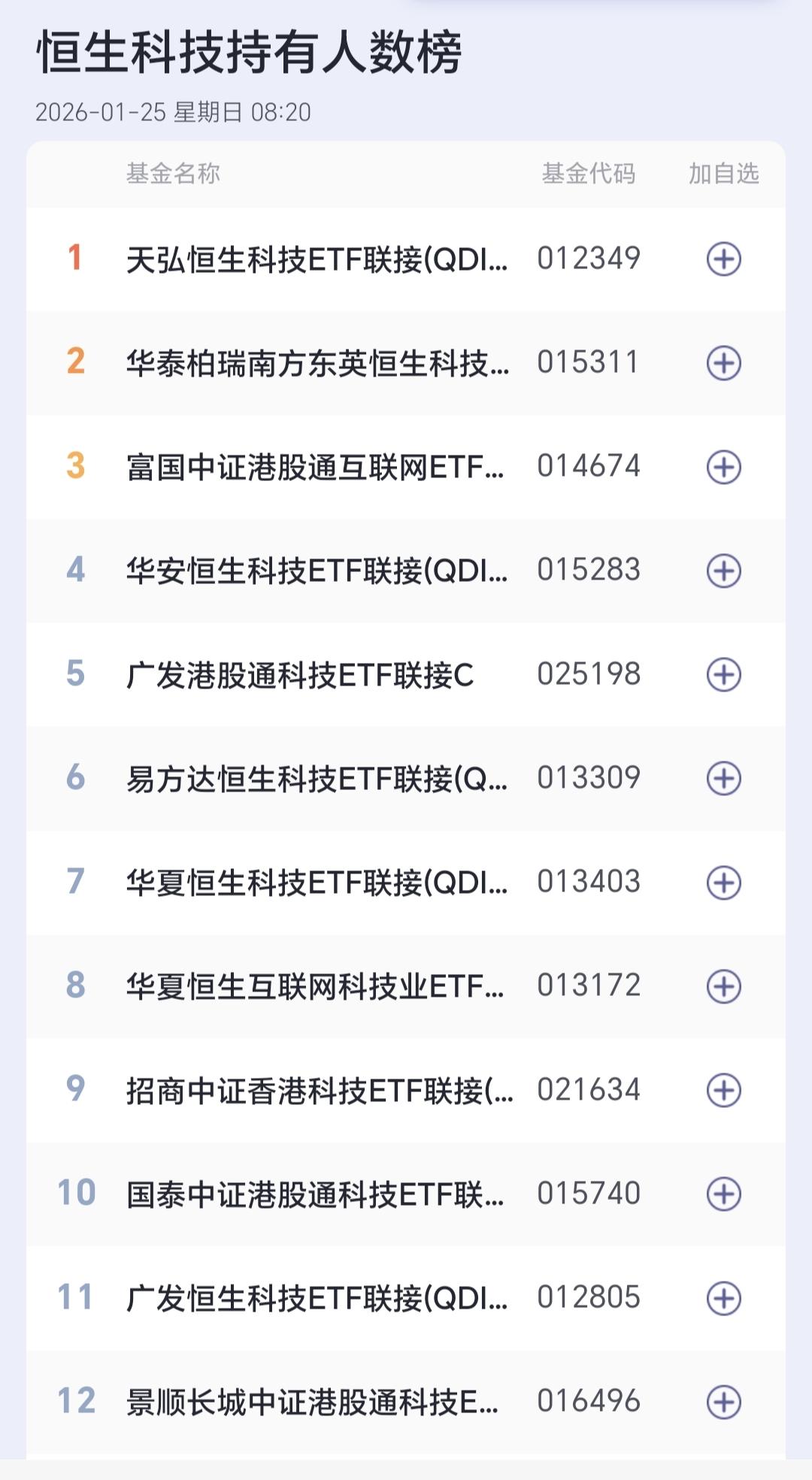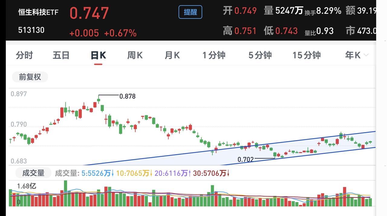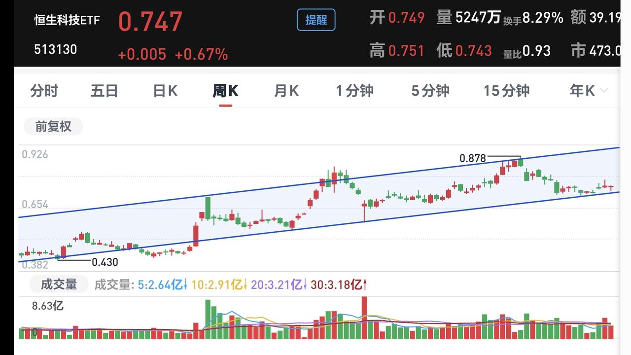 基金:恒生科技板块应该怎么办 香港市场的走势与我们大A的走势是相互影响的,究竟是谁跟着谁走不确定,香港市场的走势与外围的走势关联性也很大,他们的里面包含了许多的国际资本,基本上没有某队的托底,走势更加依赖了自身的因素,以及外围市场的影响,所以,它们的弹性更大,更容易让我们做上下的差价,这也是许多人喜欢恒生科技指数的原因。 恒生科技指数周五上涨了0.62%,在三大指数中上涨幅度最大,这个板块连续上涨了3个交易日,持有人数在所有板块当中排名第11位,散户人数也是不少。 这个板块周五加仓排行榜见下面的截图4,持有人数排行榜见下面的截图5,加仓人数最多的是华夏恒生科技ETF,持有人数最多的是天弘恒生科技ETF。 看下面的截图6,这是恒生科技板块日K线图,现在的位置处于这个上涨通道当中,短线持有的人,这个上涨通道的下轨线就是持有条件,这个上涨通道是日线级别的超准短期通道,只有短线和超短线的人,才能把这条下轨线作为持有条件。 看下面的截图7,这是恒生科技板块周K线图,现在的位置处于这个上涨通道中,距离上涨通道的下轨线很近,技术上讲,这个区域就是长线的进场点,但如果跌破这个上涨通道的下轨线,特别是以中大阴线跌破这个上涨通道的下轨线,长线持有的人是需要止盈出来观望的。 上涨通道和下跌通道是从已有走势当中总结出来的规律,并不全部代表后面的走势,只是大概率指明了后面走势的方向,所以,按照上涨通道和下跌通道走势来操作,正确只是大概率,并不一定100%正确。 没有哪一种策略能够100%正确,没有哪一种策略能够适应所有时段的走势,有些时段某种策略比较好用,另外一些时段有可能是别的策略比较好用,但你不能提前知道,现在的时段适用于哪一种策略,我们只要坚持按照一种策略来应对就可以了,它总归会碰到好用的时段。 大家帮忙评论,点赞,转发和分享,谢谢大家的支持。