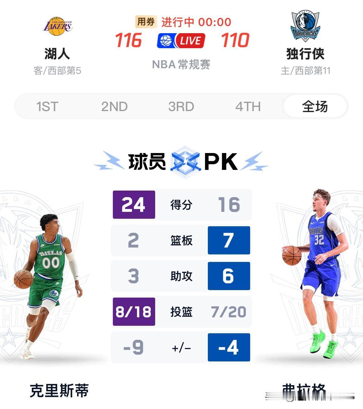 看湖人比赛请备好速效救心丸! 本来一场酣畅淋漓的比赛硬是打成了惊心动魄。 上半场65:52领先13分,没想到第三节单节狂输21分,第四节独行侠一度领先达14分之多,最后7分钟湖人才如梦初醒,完成14分大逆转116:110战胜独行侠。 东契奇砍下33分8板1 1助,詹姆斯1 7分8板5助攻,弗拉格16分7板6助,湖人旧将克里斯蒂24分2板了助。 湖人凭借本场胜利排名反超太阳至西部第五!