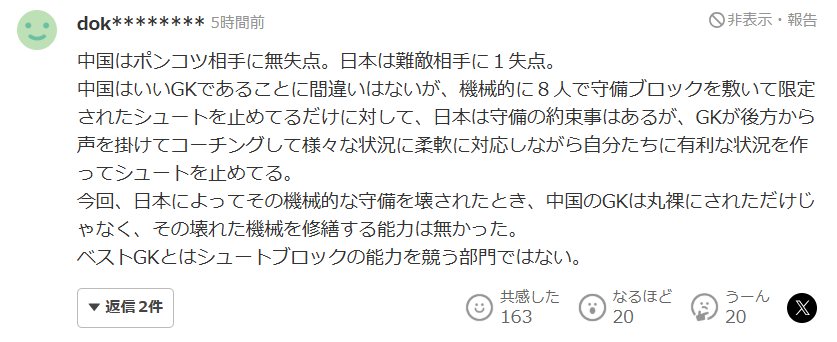 中国的门将确实是一名好门将,这点毋庸置疑,但他们更多是机械式地摆出8人的大巴,在射门路线被严格限定的情况下完成扑救。而日本这边,虽然同样有明确的防守约定,但门将会在后方不断出声指挥、进行场上教练式的沟通,在各种局面下灵活应对,主动创造对自己有利的情形并完成扑救。