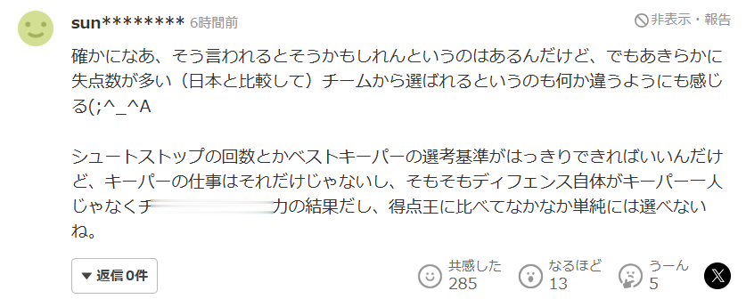 确实啊被这么一说,确实也有“好像是这么回事”的感觉,但从一个失球数明显更多(和日本相比)的球队里选人,又总觉得哪里不太对。要是能把扑救次数之类的最佳门将评选标准明确下来就好了,可门将的工作又不仅仅是扑救,而且防守本来就不是门将一个人的事,而是全队整体防守能力的体现,所以和只看进球数就能决定的金靴相比,门将的评选确实没法那么简单。