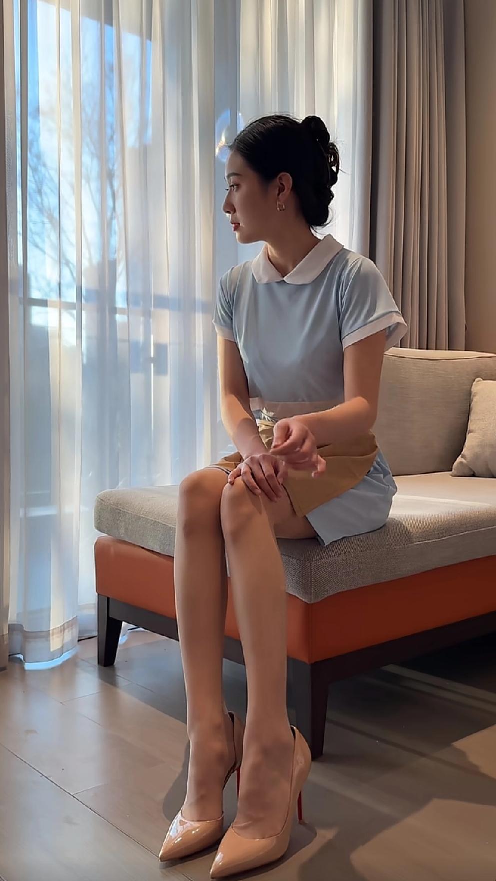 优雅蓝裙搭配高跟鞋,静坐窗边,享受宁静时光。