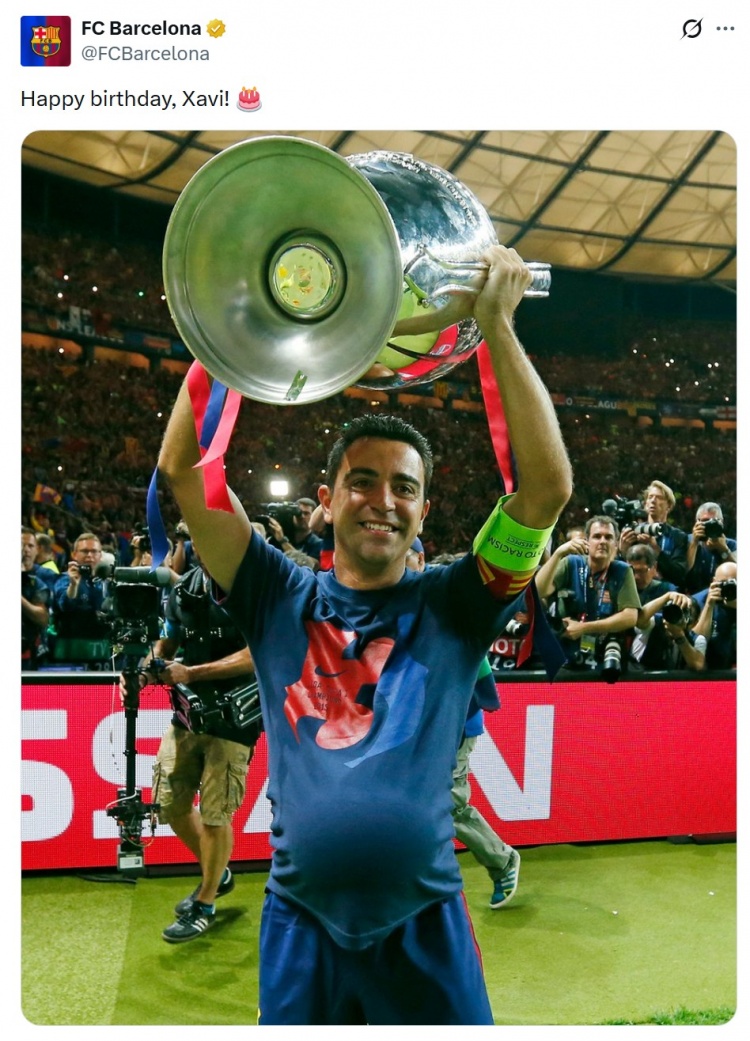 巴萨官方社媒晒出哈维举起奖杯的照片,配文:“生日快乐,哈维!”