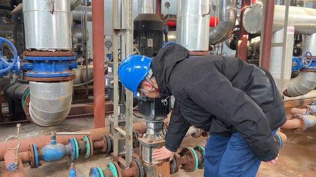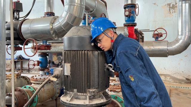 推开安居社区换热站的铁门,轰鸣声裹挟着热气扑面而来,与室外的酷寒形成强烈反差。于成龙熟练地戴上安全帽,径直走向墙角的循环水泵,侧耳贴在冰冷的外壳上,像医生听诊般凝神细听。“嗡嗡声是正常的,要是有咔嗒声或者其他异响声,就是设备闹脾气了。”这是他九年练出的“顺风耳”。