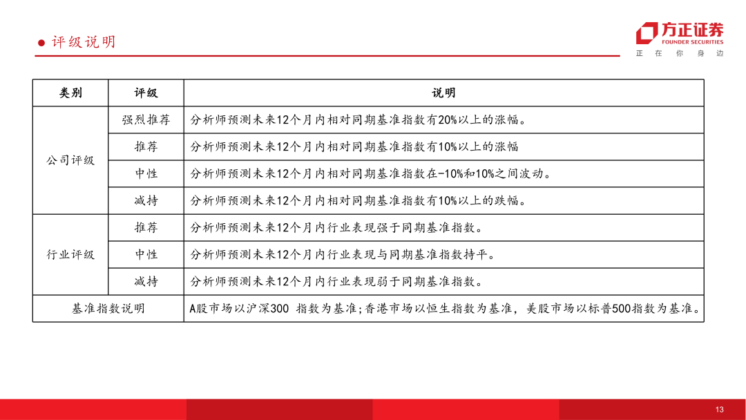 本研究报告由方正证券制作及在中国(香港和澳门特别行政区、台湾省除外)发布。根据《证券期货投资者适当性管理办法》,本报告内容仅供我公司适当性评级为C3及以上等级的投资者使用,本公司不会因接收人收到本报告而视其为本公司的当然客户。若您并非前述等级的投资者,为保证服务质量、控制风险,请勿订阅本报告中的信息,本资料难以设置访问权限,若给您造成不便,敬请谅解。在任何情况下,本报告的内容不构成对任何人的投资建议,也没有考虑到个别客户特殊的投资目标、财务状况或需求,方正证券不对任何人因使用本报告所载任何内容所引致的任何损失负任何责任,投资者需自行承担风险。本报告版权仅为方正证券所有,本公司对本报告保留一切法律权利。未经本公司事先书面授权,任何机构或个人不得以任何形式复制、转发或公开传播本报告的全部或部分内容,不得将报告内容作为诉讼、仲裁、传媒所引用之证明或依据,不得用于营利或用于未经允许的其它用途。如需引用、刊发或转载本报告,需注明出处且不得进行任何有悖原意的引用、删节和修改。