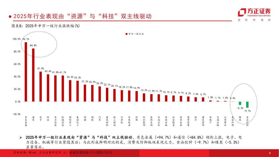 4.A股行业表现呈现“资源+科技”双主线轮动。有色金属(+94.7%)、通信(+84.8%)领涨,电子、电力设备也有不错表现;消费与防御板块表现疲软,食品饮料领跌。