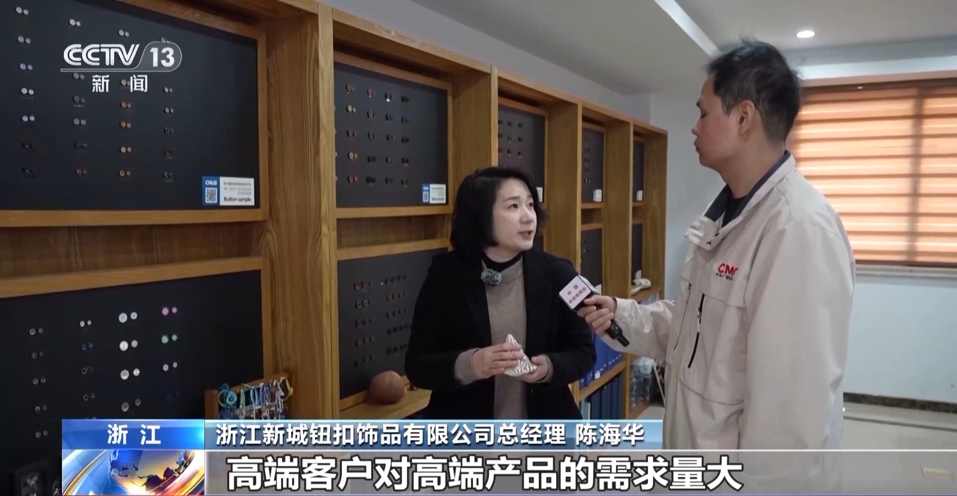 浙江新城钮扣饰品有限公司总经理陈海华:高端客户对高端产品的需求量大,所以我们通过这个点子开发不同的产品和材质,从而提升产品的附加值。