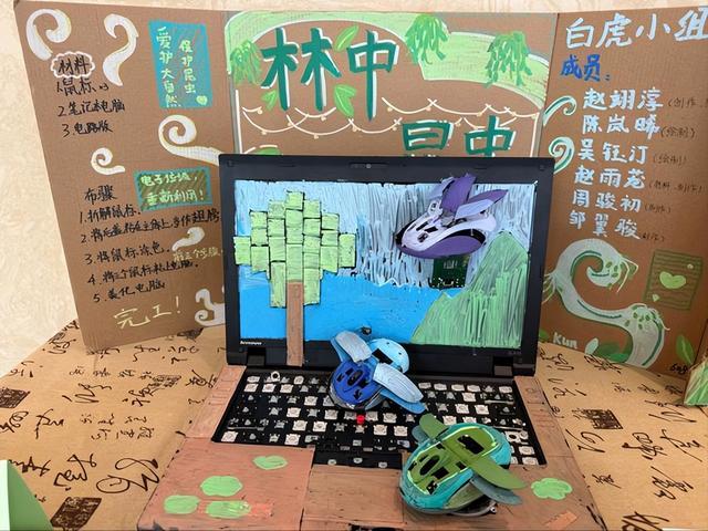 废弃电脑、鼠标,废纸板等材料能变成什么?近日,在杭州市保俶塔实验学校的劳动成果展上,同学们发挥各自的创意,给出了出人意料的答案:绿意盎然的《林中昆虫》,栩栩如生的《国宝熊猫》、威风凛凛的《战船》,还有名为《白猫梦妍》的可爱创作。