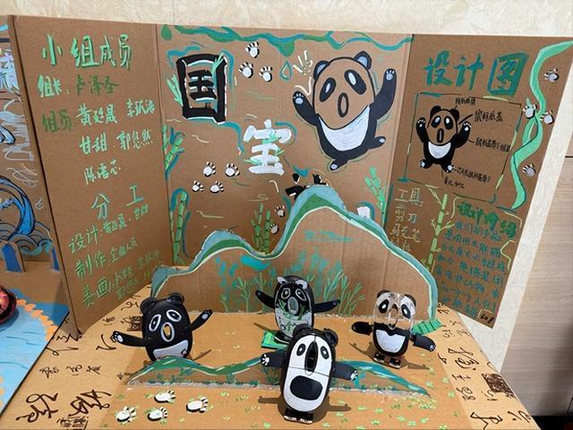 “我们用的都是废旧的鼠标和电脑零件,”六年级的黄廷晟同学举着他们的《国宝熊猫》介绍说,“熊猫耳朵是鼠标滚轮,身体是外壳拼起来的,背景板是用废弃纸皮做的。我们想用这个作品提醒大家,电子垃圾越来越多,保护环境得行动起来。”