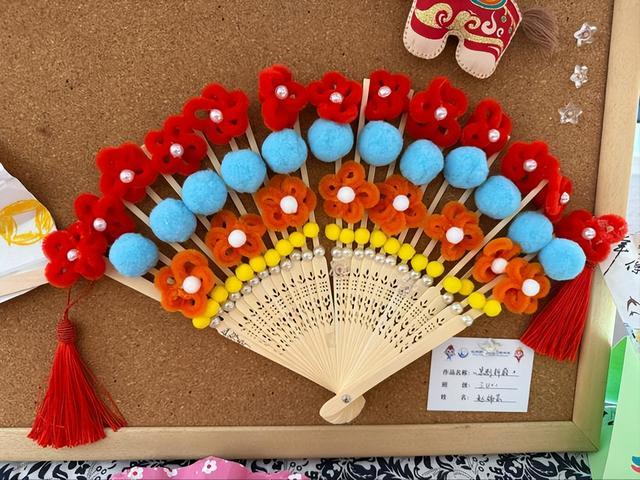 旁边另一把扇子则更加立体——扇面上装饰着用扭扭棒制作的精美头冠造型。“这是京剧里小姐戴的凤冠,”同样来自三年级(10)班的赵祎芸同学认真介绍,“我特别喜欢京剧,就把最喜欢的头饰做到扇子上了。”