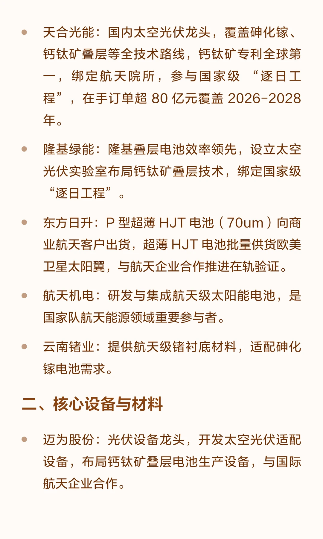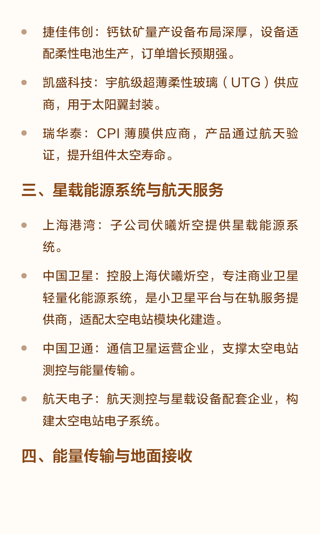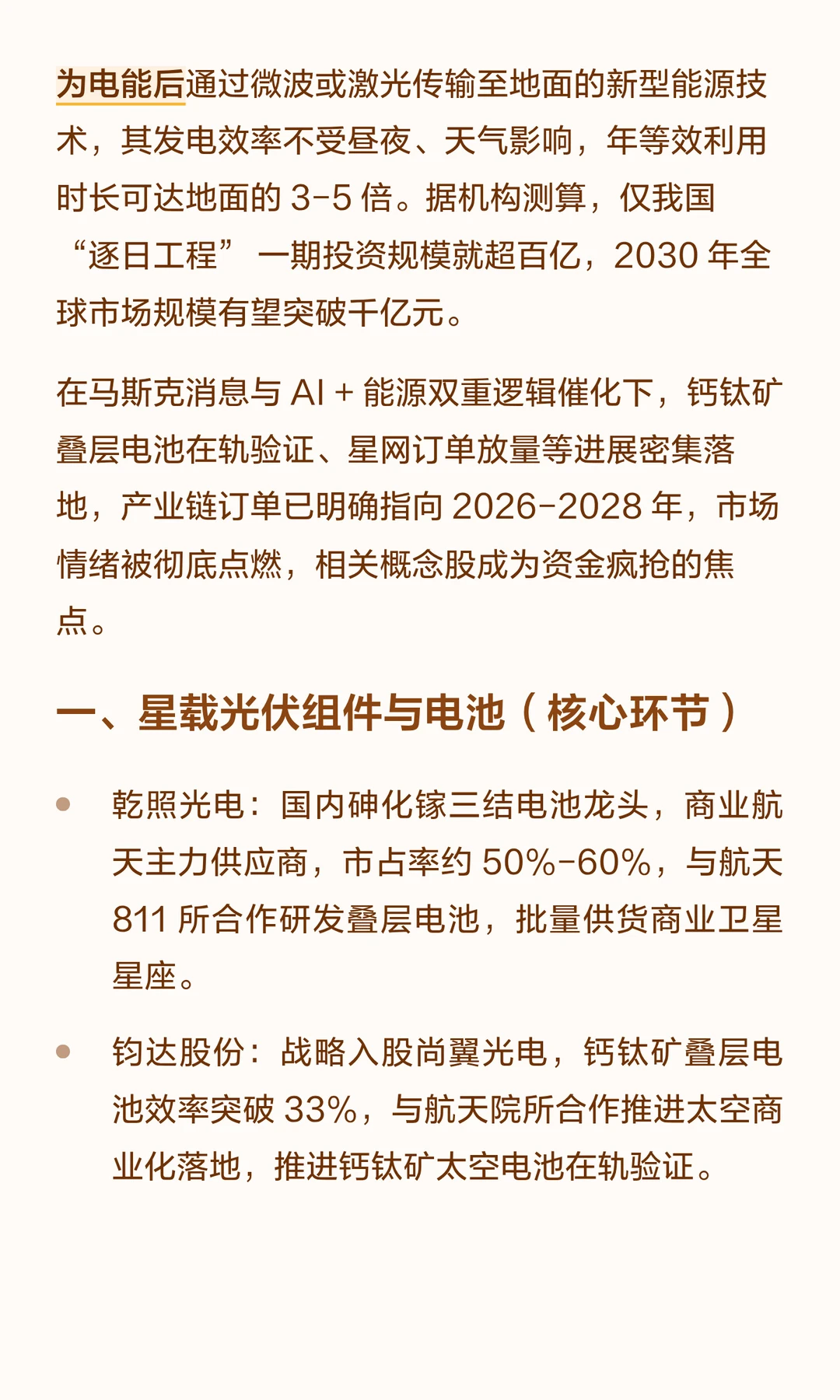 💥马斯克旗下 SpaceX 官宣启动 “星盾计划” 太空光伏部署方案,计划在低轨星座中集成光伏组件与能量传输模块,这一爆炸性消息瞬间引爆全球资本市场,让原本就火热的太空光伏题材彻底 “出圈”。与此同时,AI 技术的深度赋能正成为关键推手 ——AI 算法可实时优化光伏阵列的姿态控制与能量传输效率,而太空光伏的稳定供电又能为全球 AI 算力中心提供不间断的清洁电力,二者形成 “能源 - 算力” 的闭环共生。