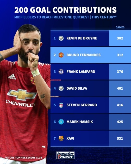 直播吧1月26日讯英超第23轮比赛,曼联在客场挑战阿森纳。本场比赛,B费助攻多尔古打进反超比分的进球,这让他在英超中直接参与进球数达到200球(103球,97助攻)。德国转会市场盘点了新世纪五大联赛最快直接参与200球中场球员,B费312场位居次席,仅次于302场的德布劳内。