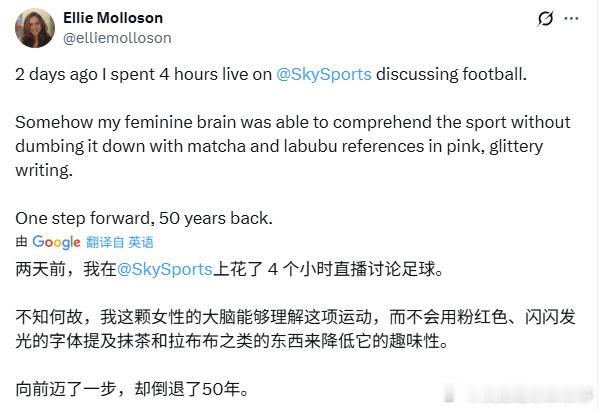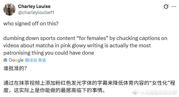 🚨天空体育前天新开了一个面向女观众的频道Halo,结果只发了几条就被批性别歧视甚至厌女……因为内容实在离谱,网友们异常团结,不论男女几乎是一边倒全差评! 新频道Halo标榜“专为女性体育迷”和“支持女运动员”,但只是加上了表情包、粉色荧光文字,这种刻板偏见和“令人作呕的居高临下的姿态”让网友感觉很不爽。账号简介是“the lil sis of Sky Sports💫”(天空体育的小妹妹),网友批评账号定位有贬低对方的成熟度和地位的含义。 关于女性体育明星的第一条内容,四位运动员被塑造成了芭比娃娃玩偶。配文:女性可以成为任何想成为的人,所以芭比娃娃也可以成为任何想成为的人。这条并没有收获好评。 前11个视频(现在被喷的删到只剩3个)有5个是关于男性体育明星,其中1个是以“Sincaraz”(两位球员名字结合)为主题,讲述网球明星辛纳和阿尔卡拉兹之间“世纪兄弟情” ,这条被指责刻意迎合女性卖腐; 哈兰德对伯恩茅斯的进球,配文是“抹茶+辣妹舞步的组合赞爆了”; F1赛车冲出赛道,配文是“当你把抹茶洒满整个 Labubu,结果卫生棉条又刚好用完,根本没法清理时的那种心情 😩🥺” ……以上3条都已删除。 网友反应↓ (更多的放在截图里) ①专注女足的账号Girls on the Ball:“这个频道能不能别再粉粉桃桃那一套了?!这个立意、这段文案……我实在想不出这会是女球迷想要的东西。” ②女足评论员Ellie Molloson:“2天前我在天空体育做了四小时节目,令人惊讶的是,我这个「女性大脑」竟能理解这项运动,而不需要借助粉色闪光字体写的抹茶和Labubu这类幼稚内容来降低理解门槛。看似前进了一步,实则倒退50年。” ③FreyaQuinton:女性希望被平等对待,而不是被塞进一个被简化为粉色、闪闪发光的特效、通过抹茶来解释足球的独立频道…… ④veradotnet:这可能比叫女人回厨房去更性别歧视,你在干什么? 😭 ⑤juliana:让我捋捋……你为什么不能在主频道“支持女运动员”?而要新建一个频道? 面对网友批评,Halo小编勇敢地在评论区对线:有人评论“真不敢相信你以为女球迷会喜欢这种东西。” Halo官号回复——“真不敢相信你带着这种能量来评论。” 《每日邮报》看热闹不嫌事大,专门就此事联系天空体育,对方拒绝置评