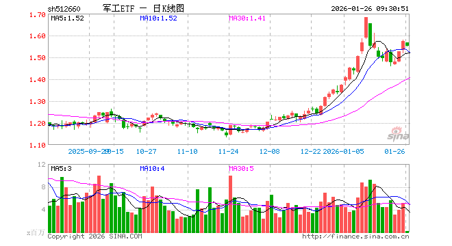 军工ETF(512660)业绩比较基准为中证军工指数收益率,管理人为国泰基金管理有限公司,基金经理为艾小军,成立(2016-07-26)以来回报为57.03%,近一个月回报为26.12%。