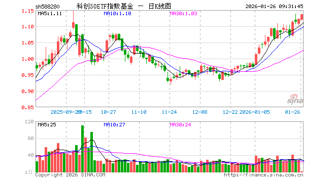 1月26日,科创50ETF指数基金(588280)开盘跌0.27%,报1.119元。科创50ETF指数基金(588280)重仓股方面,中芯国际开盘跌0.76%,寒武纪跌0.75%,海光信息跌0.18%,澜起科技跌1.14%,中微公司跌0.15%,金山办公涨1.71%,联影医疗涨1.33%,拓荆科技跌1.99%,芯原股份涨4.55%,沪硅产业涨0.04%。