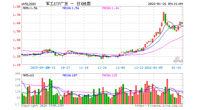 1月26日,军工ETF广发(512680)开盘跌0.37%,报1.606元。军工ETF广发(512680)重仓股方面,中国船舶开盘涨0.08%,光启技术跌0.36%,航天电子跌4.64%,中国卫星跌1.15%,航发动力跌1.01%,中航沈飞跌0.43%,中航光电涨0.05%,航天发展跌3.40%,菲利华跌1.04%,睿创微纳涨4.61%。