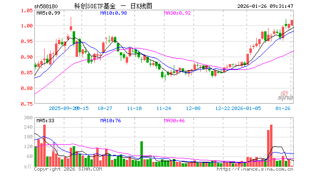 1月26日,科创50ETF基金(588180)开盘跌0.40%,报1.000元。科创50ETF基金(588180)重仓股方面,中芯国际开盘跌0.76%,寒武纪跌0.75%,海光信息跌0.18%,澜起科技跌1.14%,中微公司跌0.15%,金山办公涨1.71%,联影医疗涨1.33%,拓荆科技跌1.99%,芯原股份涨4.55%,沪硅产业涨0.04%。