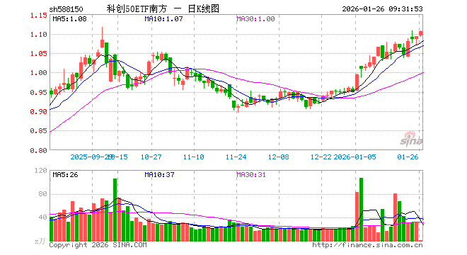 1月26日,科创50ETF南方(588150)开盘涨0.18%,报1.095元。科创50ETF南方(588150)重仓股方面,中芯国际开盘跌0.76%,寒武纪跌0.75%,海光信息跌0.18%,澜起科技跌1.14%,中微公司跌0.15%,金山办公涨1.71%,联影医疗涨1.33%,拓荆科技跌1.99%,芯原股份涨4.55%,沪硅产业涨0.04%。