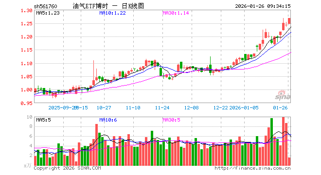1月26日,油气ETF博时(561760)开盘涨0.32%,报1.247元。油气ETF博时(561760)重仓股方面,中国海油开盘涨1.59%,中国石油涨0.71%,中国石化涨0.49%,杰瑞股份跌0.43%,招商轮船涨2.22%,广汇能源涨1.34%,中远海能涨2.24%,洲际油气涨2.73%,海油工程涨0.31%,招商南油涨0.58%。