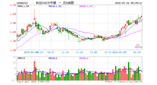 1月26日,科创50ETF中银(588720)开盘涨0.00%,报1.560元。科创50ETF中银(588720)重仓股方面,中芯国际开盘跌0.76%,寒武纪跌0.75%,海光信息跌0.18%,澜起科技跌1.14%,中微公司跌0.15%,金山办公涨1.71%,联影医疗涨1.33%,拓荆科技跌1.99%,芯原股份涨4.55%,沪硅产业涨0.04%。