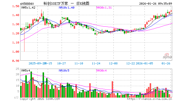 1月26日,科创50ETF万家(588840)开盘涨0.07%,报1.435元。科创50ETF万家(588840)重仓股方面,中芯国际开盘跌0.76%,寒武纪跌0.75%,海光信息跌0.18%,澜起科技跌1.14%,中微公司跌0.15%,金山办公涨1.71%,联影医疗涨1.33%,拓荆科技跌1.99%,芯原股份涨4.55%,沪硅产业涨0.04%。