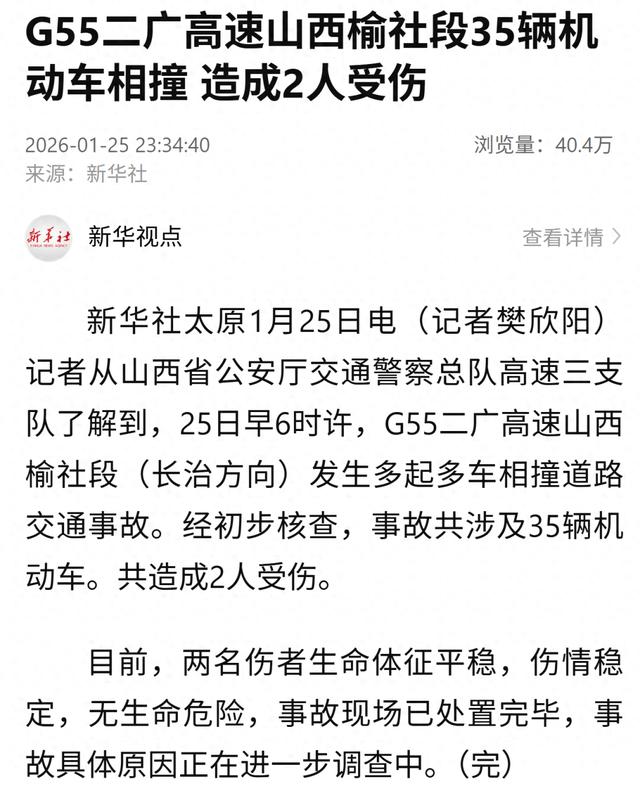 G55二广高速山西榆社段35辆机动车相撞,2人受伤,无生命危险,事故现场处置完毕