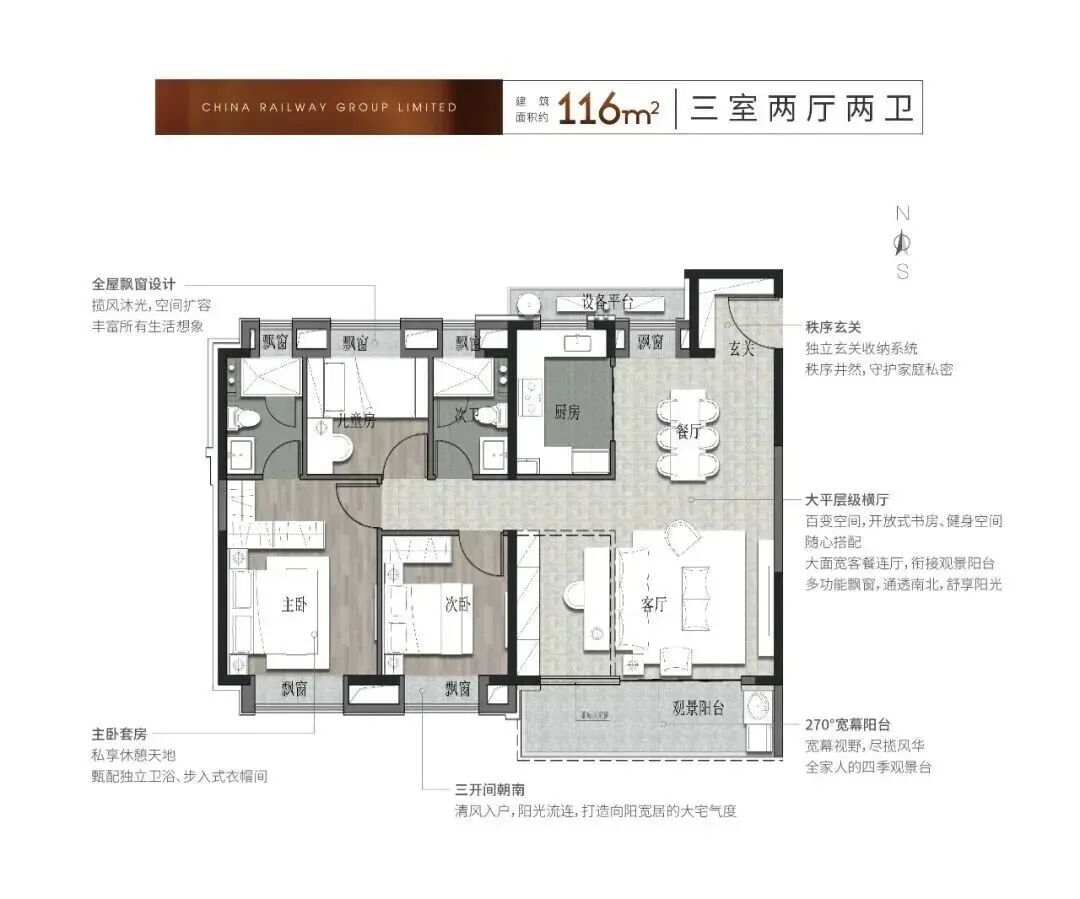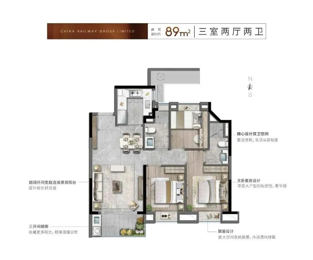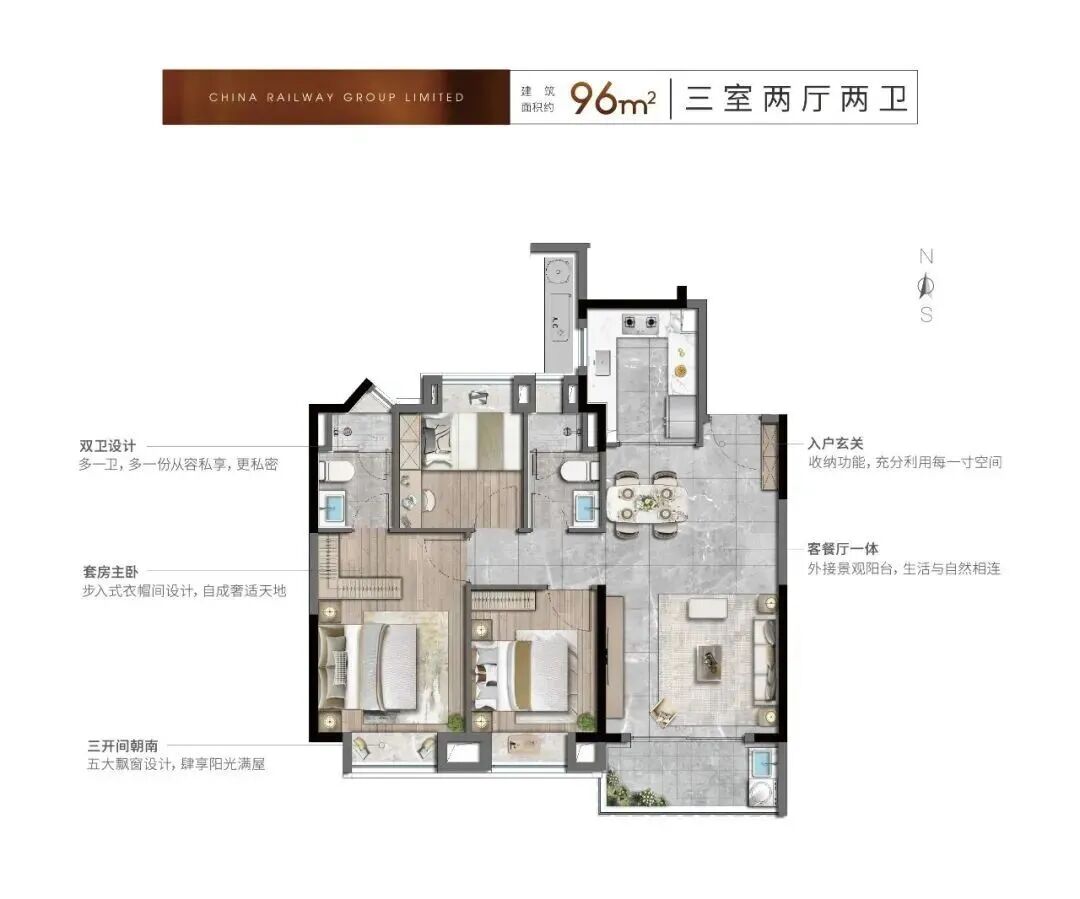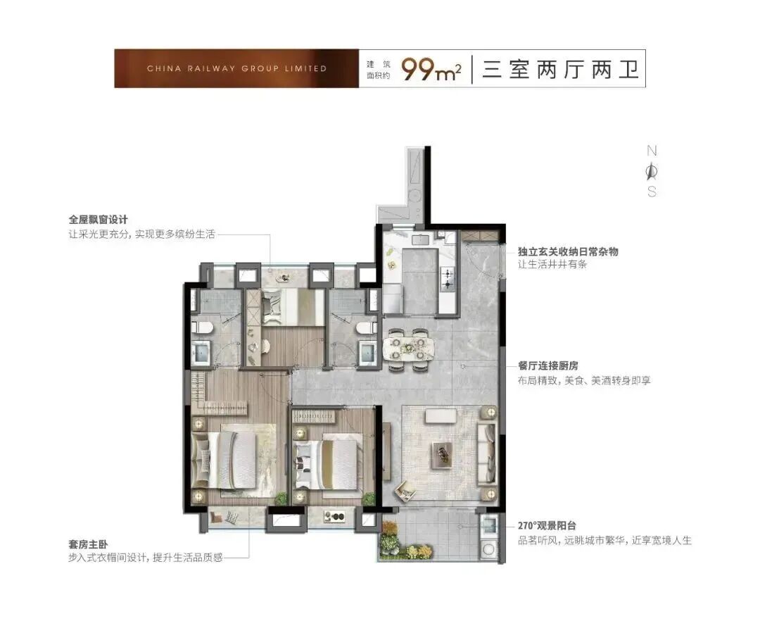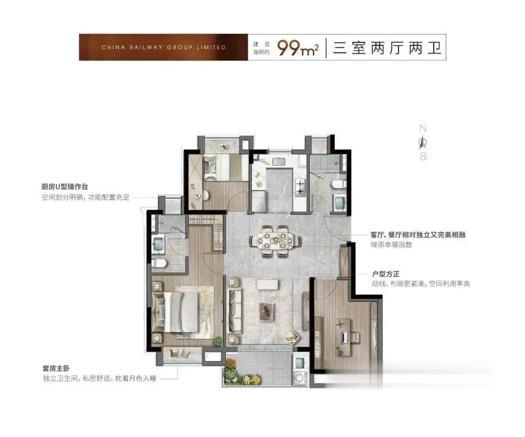 走进约99㎡户型室内,超高得房率为业主们带来了超出预期的空间尺度,南向宽景大客厅将阳光引入室内,漫过开放式餐厨区,明亮而通透,“这种通透感真是太难得了,住着心情都会变好”,来自准业主的评价,印证着中铁诺德璟宸对空间尺度与居住舒适度的精准把控。