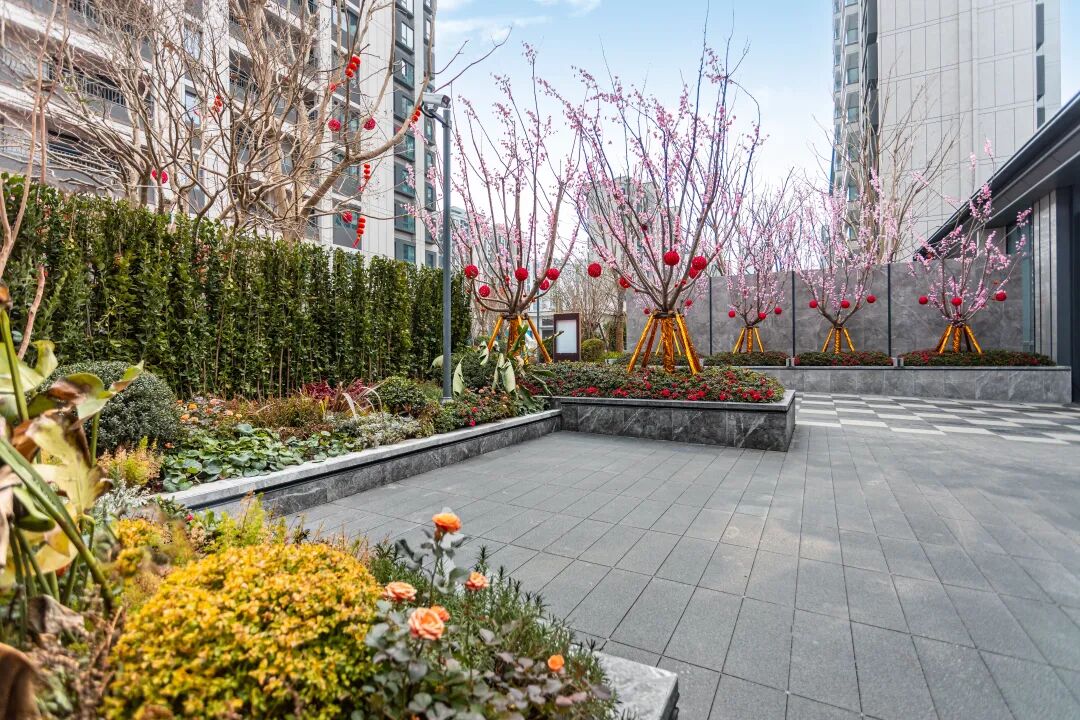步入社区,迎宾夹道两侧,樱花列植形成礼序长廊,无患子树、金桂错落分布,在营造层次丰富景观的同时,也为业主的每一次归家赋予尊崇仪式感。