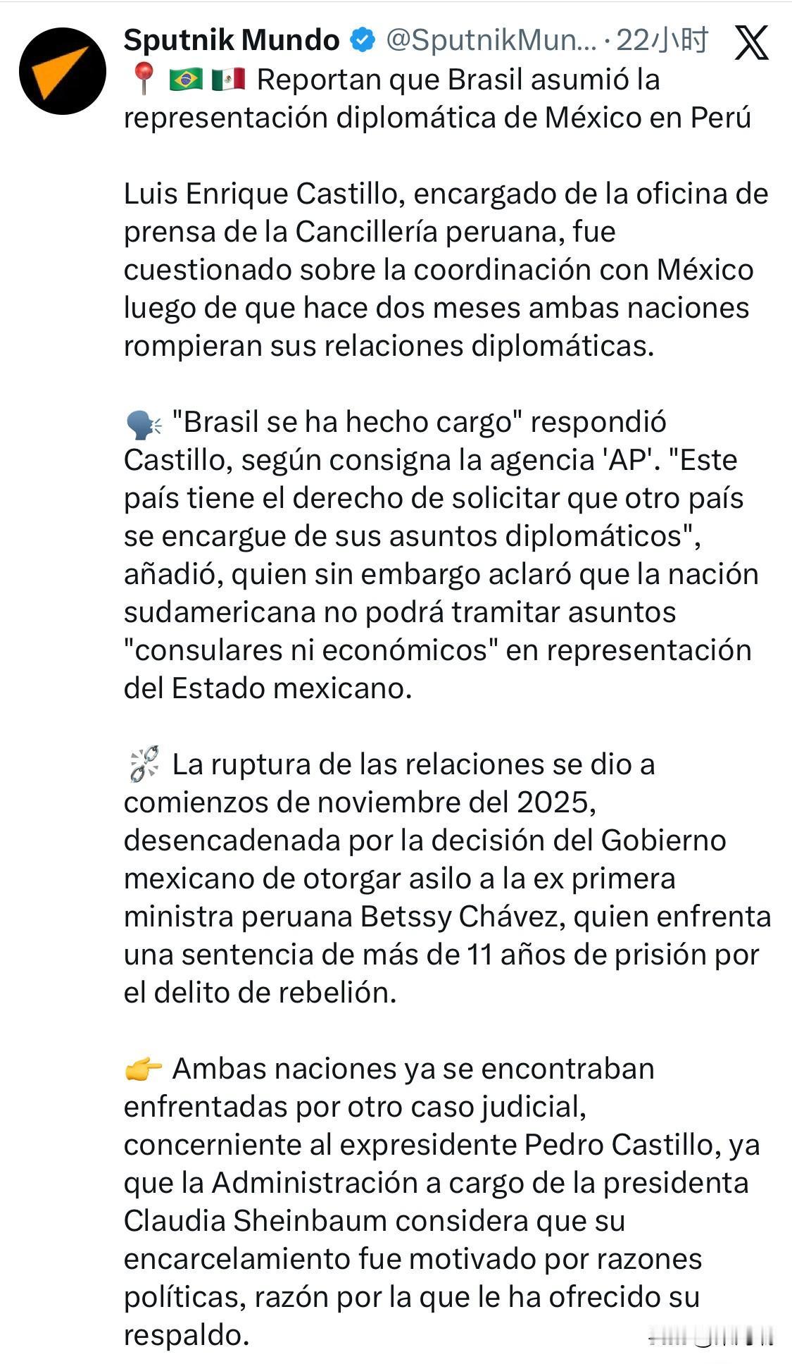 应墨西哥政府请求并经秘鲁政府同意,巴西外交部宣布接管墨西哥驻秘鲁的外交利益。巴西将负责保护墨西哥驻利马大使馆的馆舍、官邸、财产及档案。 自2026年1月24日起,巴西国旗已在墨西哥驻秘鲁大使馆建筑上空升起。 2025年11月初,秘鲁政府宣布与墨西哥断绝外交关系。直接诱因是墨西哥驻秘鲁大使馆向秘鲁前总理贝特西·查韦斯(Betssy Chávez)提供政治庇护。 查韦斯因涉嫌参与前总统佩德罗·卡斯蒂略在2022年企图解散国会的“政变案”而面临叛乱和阴谋指控,并已被判处超过11年监禁。秘鲁国会曾因此宣布墨西哥现任总统克劳迪娅·辛鲍姆(Claudia Sheinbaum)为“不受欢迎的人”,指责其干涉内政。 尽管两国外交关系(大使级)中断,但秘鲁和墨西哥仍维持着领事关系。这意味着两国公民在对方境内的领事服务、签证及2026年4月秘鲁大选在墨境内的投票安排暂不受直接影响。 巴西在此次外交僵局中充当了调解和行政支持的角色,体现了拉美内部处理此类外交危机的传统方式。 目前,墨西哥外交官已于2025年11月撤离秘鲁,后续外交沟通将通过巴西渠道进行。