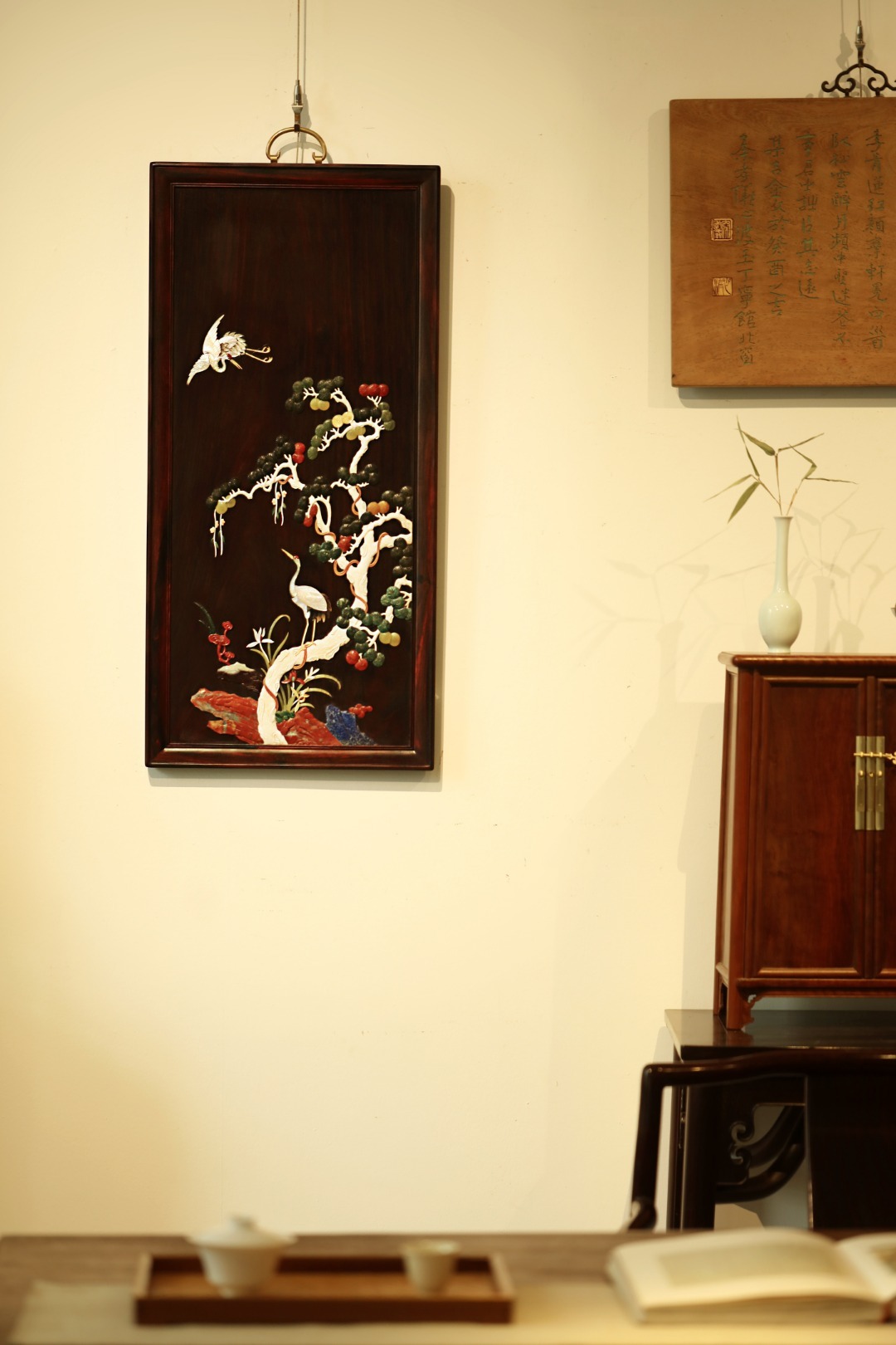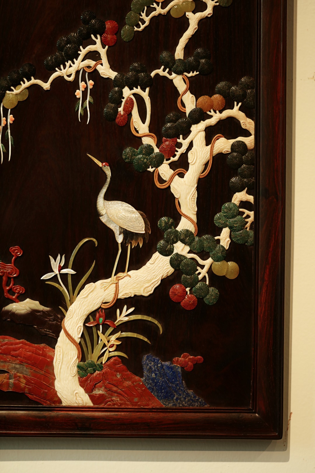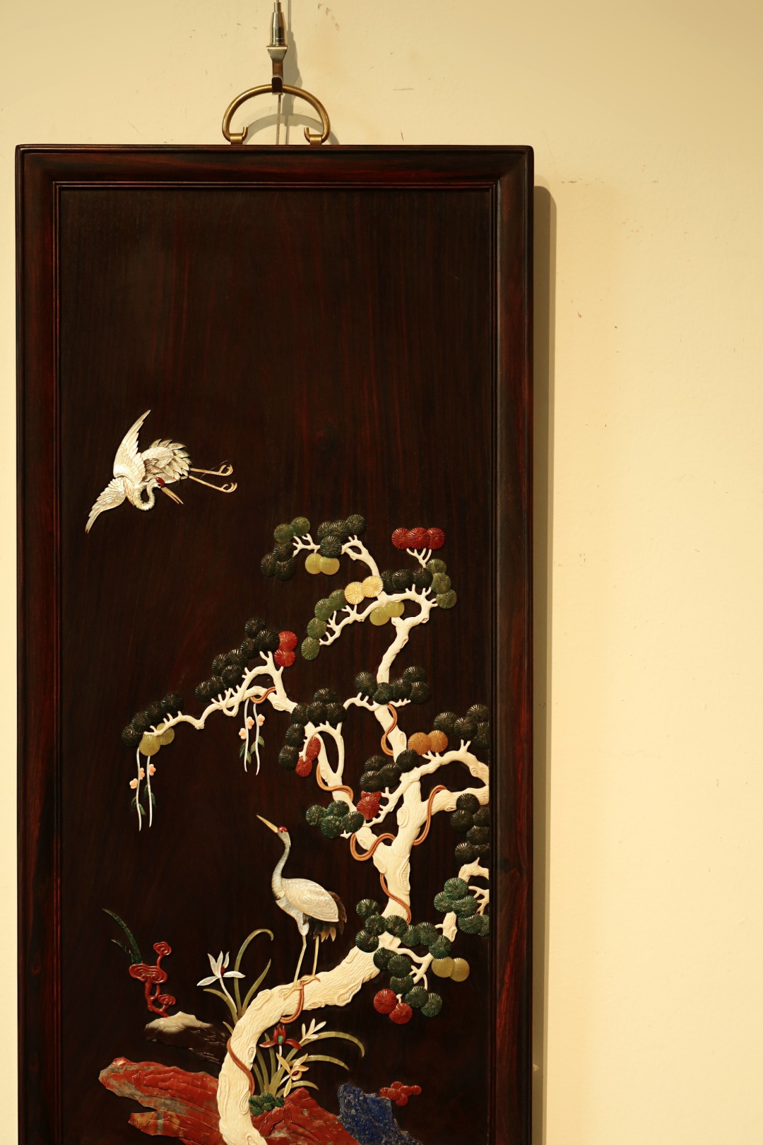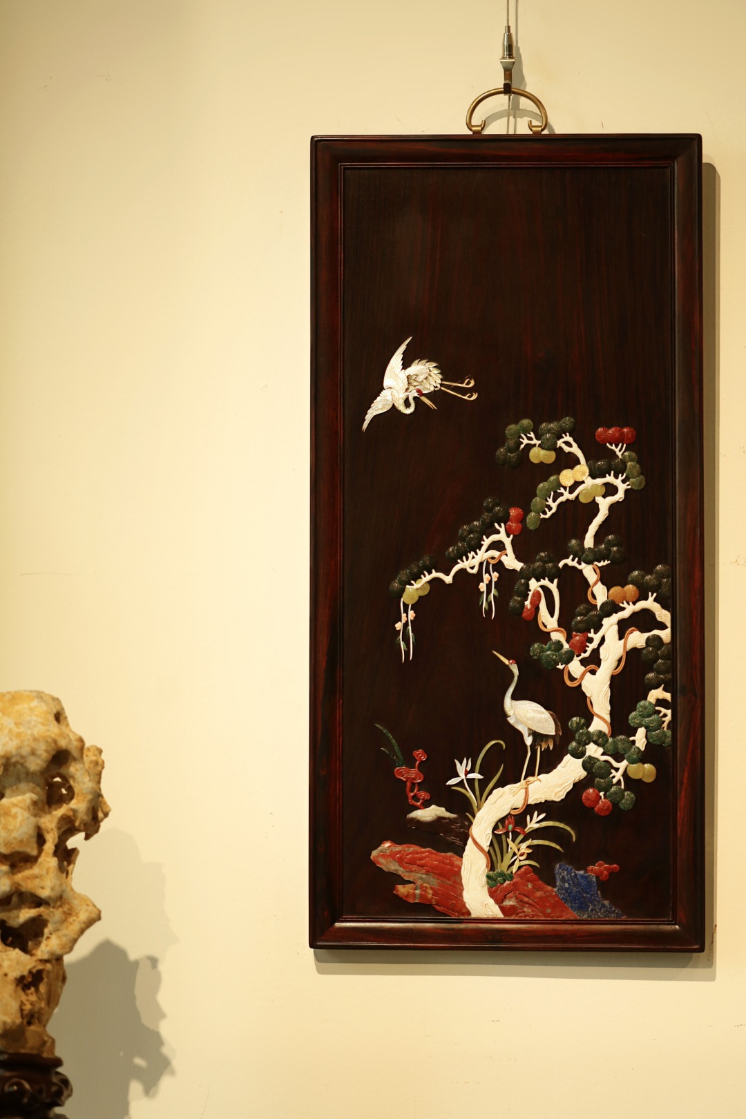 酸枝x百宝嵌 | 松鹤延年·挂屏大红酸枝独板所制,画面二只仙鹤,苍松浓郁,回首顾