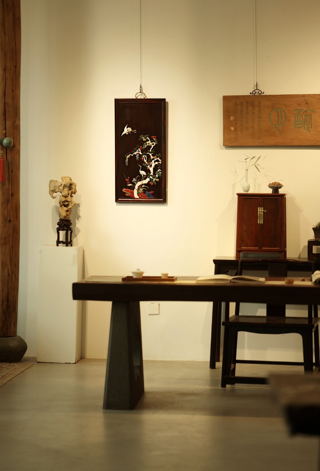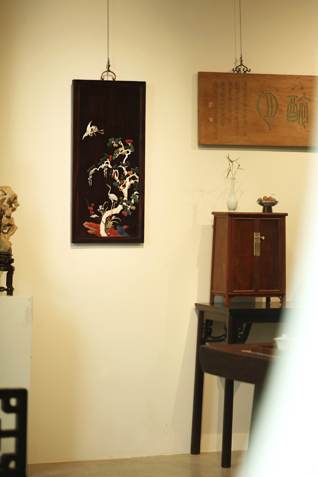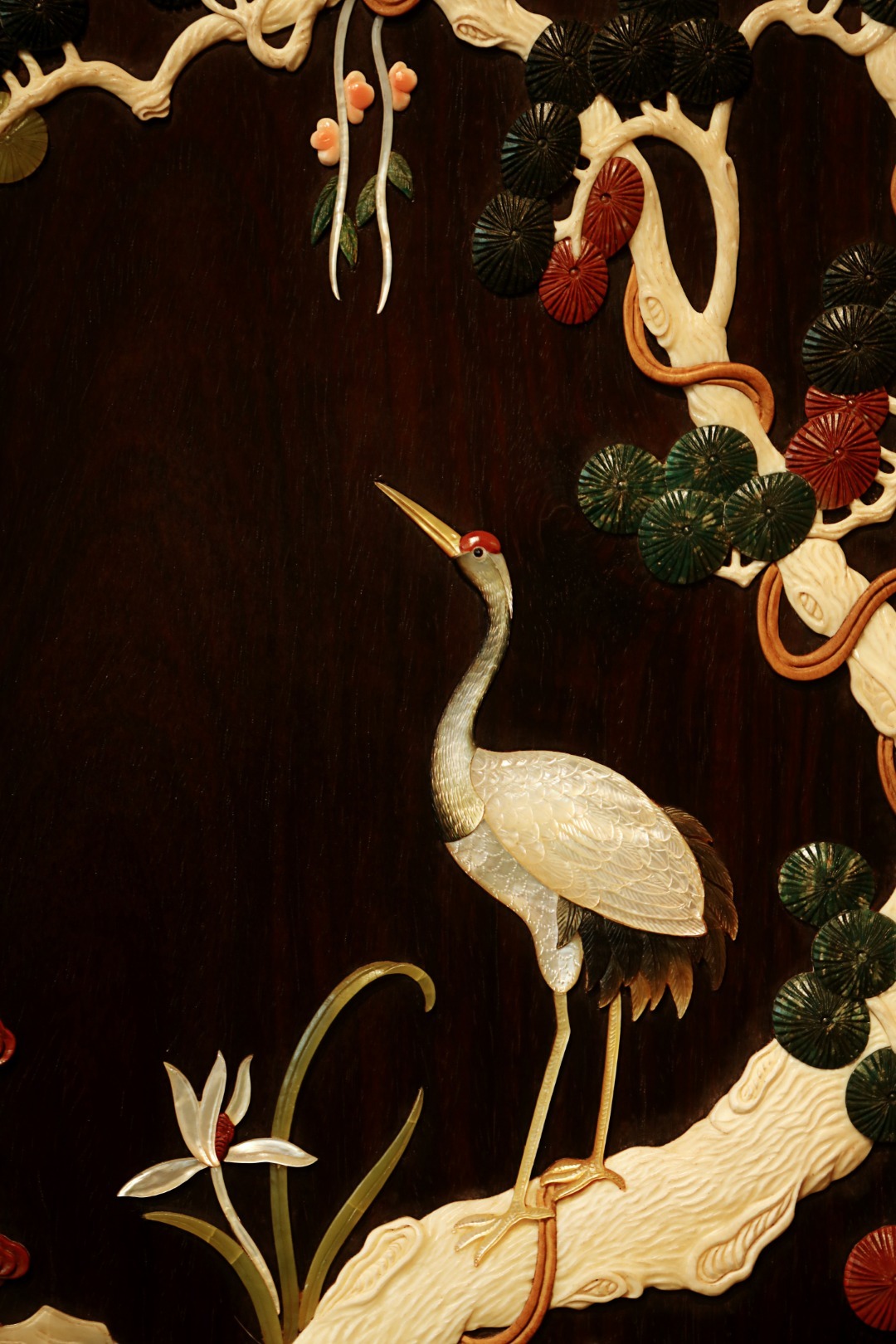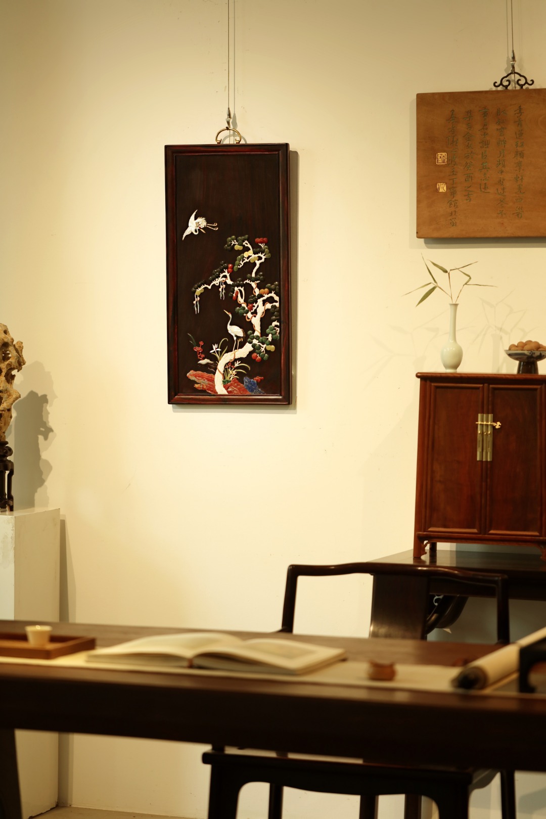 酸枝x百宝嵌 | 松鹤延年·挂屏大红酸枝独板所制,画面二只仙鹤,苍松浓郁,回首顾