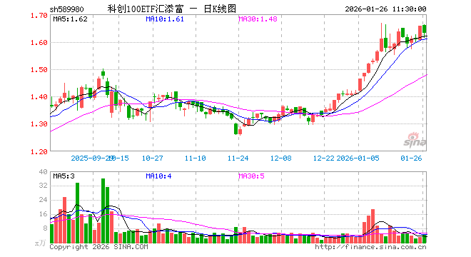 科创100ETF汇添富(589980)业绩比较基准为上证科创板100指数收益率,管理人为汇添富基金管理股份有限公司,基金经理为罗昊,成立(2025-04-25)以来回报为65.75%,近一个月回报为21.84%。