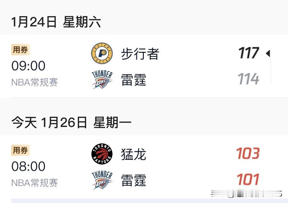 亚历山大空砍2 4分3板6助,猛龙送雷霆两连败。 24日雷霆114:117不敌东部副班长步行者队,今日又101:103惜败猛龙队,收获赛季首次两连败。赛季初雷霆梦幻开局,好多人以为他们会打破勇士赛季73胜的纪录,随着赛季深入,一是伤病带来了一些麻烦,二是别队对雷霆的研究更透,三是联盟鼓励对抗再得不到那么多哨子了,雷霆三节打卡的可能性越来越小。 本赛季的雷霆并非不能战胜,卫冕之路异常艰难,加油,雷霆、亚历山大。