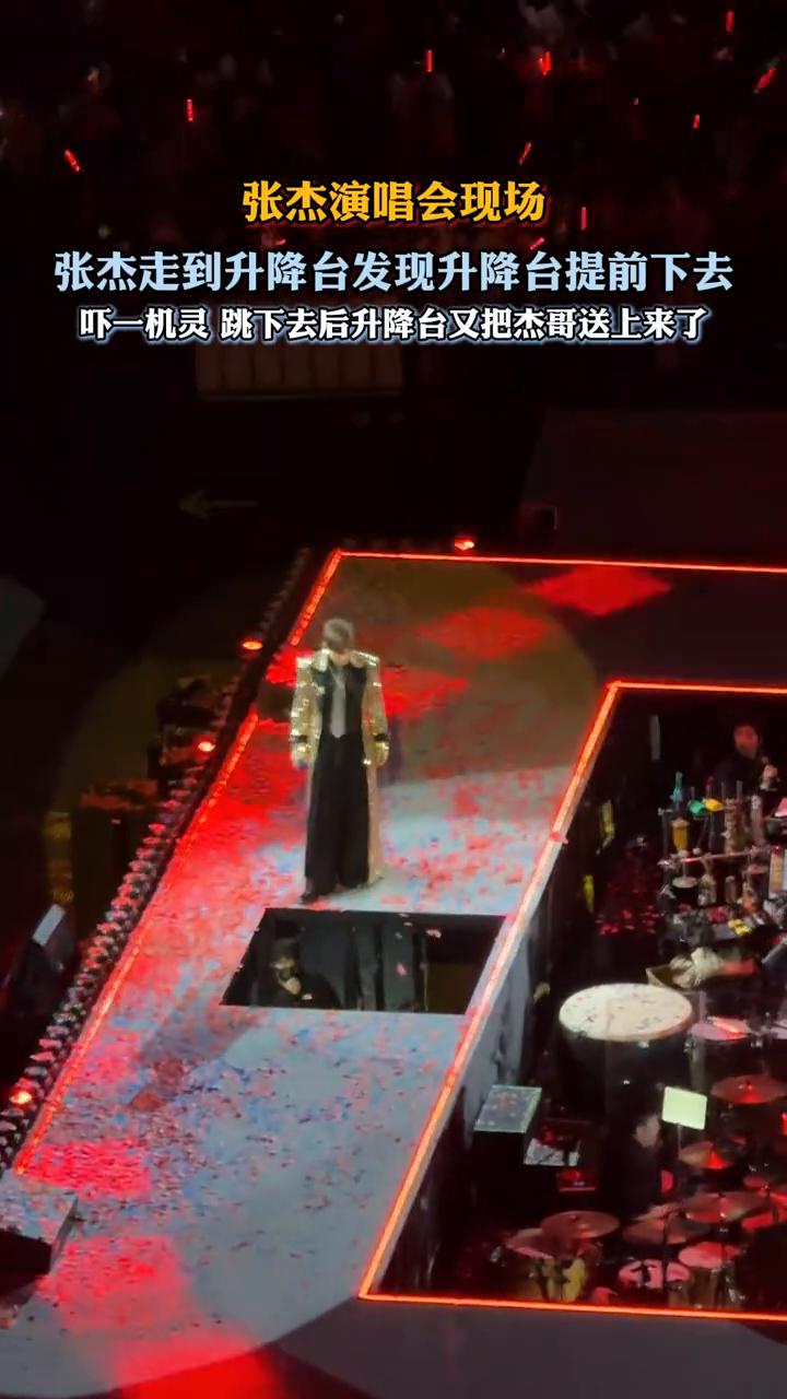 张杰演唱会现场。 张杰走到升降台发现升降台提前下去,吓一机灵跳下去后升降台又把杰哥送上来了。内心os:什么情况?我还没上来怎么就下去了?不能让他们发现,赶紧耍个帅糊弄一下。你上来,怎么还不上来?算了,灯灭了我自己跳下去,他们不会发现是失误的。我真聪明,怎么又给我送上来了?放我下去,你尔多隆吗?一号男嘉宾遗憾离场。下班开会。