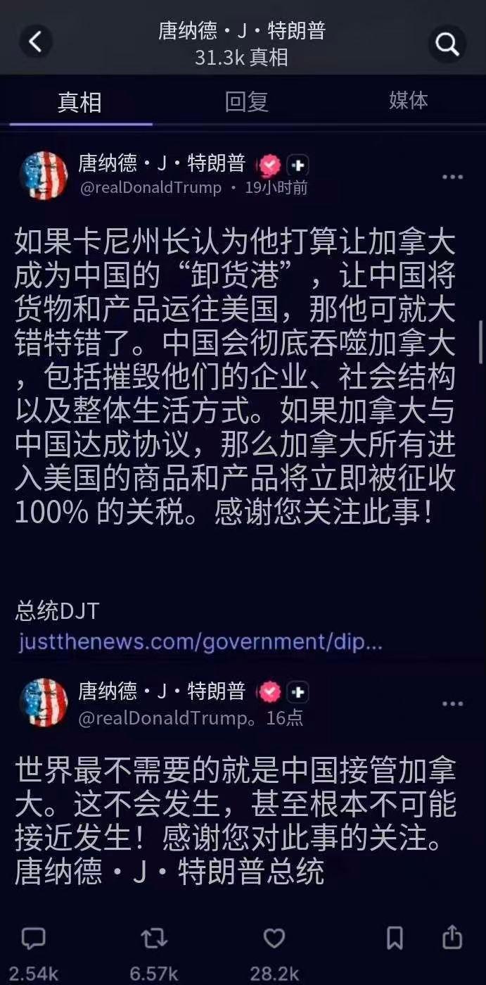 特朗普翻脸了,要给加拿大加税100%:中国正在“吞噬”加拿大 当地时间1月24日,特朗普在社媒连发两条推文(图1、图2),宣称将会阻止中国“接管”和“吞噬”加拿大,威胁如果中加两国达成贸易协议,就要对加拿大的所有输美商品加征100%关税。 在推文中,特朗普将卡尼称为“州长”,羞辱意味明显,并称加拿大会成为中国商品的“转运港”,甚至就连加拿大的社会结构和整体生活方式,也都要被中国摧毁。 当初卡尼访华后,特朗普还乐呵呵地表示“这很不错,谁能跟中国达成协议就去”,没想到这才过了一周,特朗普就翻脸了,至于原因,我认为有两点: 首先,卡尼访华后的表现进一步触怒了特朗普:在魁北克,他高喊“加拿大属于加拿大人”、“加拿大不因美国的存在而存在”。在达沃斯,他号召全球“中等强国”联手建立新秩序,要和被美国破坏的旧秩序彻底割裂,这些举动使美国权威大大受损,也让特朗普意识到,加拿大在卡尼的领导下,正在谋求经济自主甚至是更多方面的自主,这他不能接受。 接着,特朗普虽然希望和中国搞好关系,但也只是希望美国能和中国做生意而已,对于中国和美国盟友的过深交往,他是敏感且反感的:特朗普认为,西半球的全部利益和主导权应该归美国所有,所以他极力禁止中国的经济等影响力渗入该区域。而对加拿大发出关税威胁,就是他“唐罗主义”的一个直观体现。 事实上,特朗普对中加两国正常贸易合作的指控完全站不住脚,“吞噬”一词,或许用在美国自己身上比较合适,加拿大的经济高度依赖美国,能源、锂矿等命脉也被美国高度把持,中国并不想“接管”加拿大,想这么干并且正在这么干的是美国,而且这话从一个要将加拿大变成本国第“51州”的人口中说出,显得有些可笑。