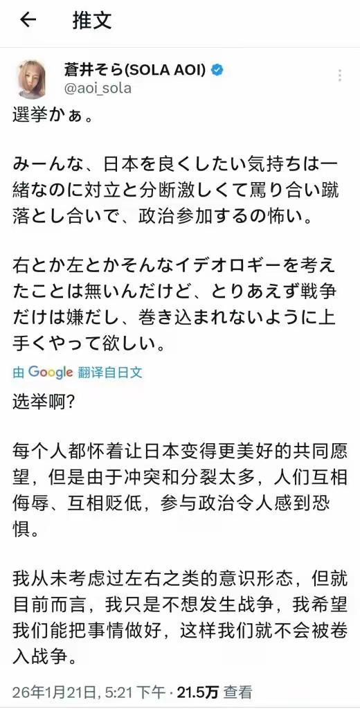 日本主流艺术家苍井发文表达自己立场,她说参与政治让人发呕,希望不要发生战争。 这位日本艺术家就是有风骨,她是日本之光,也是一个明白人。是千千万日本女性的榜样。 在文中苍井表示,她从未考虑左右意识形态,只是希望日本越来越好,不被卷入战争之中, 苍井的态度起值得日本右翼学习的,她是明白人。 希望高市以苍井为榜样,带领日本走上正确的道路。