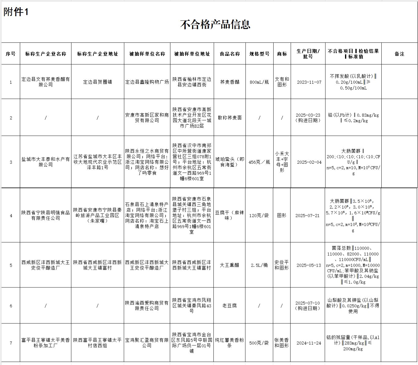 陕西省市场监督管理局组织的食品安全监督抽检中,检出7批次样品不合格。产品抽检结果可查询https://spcjsac.gsxt.gov.cn/。