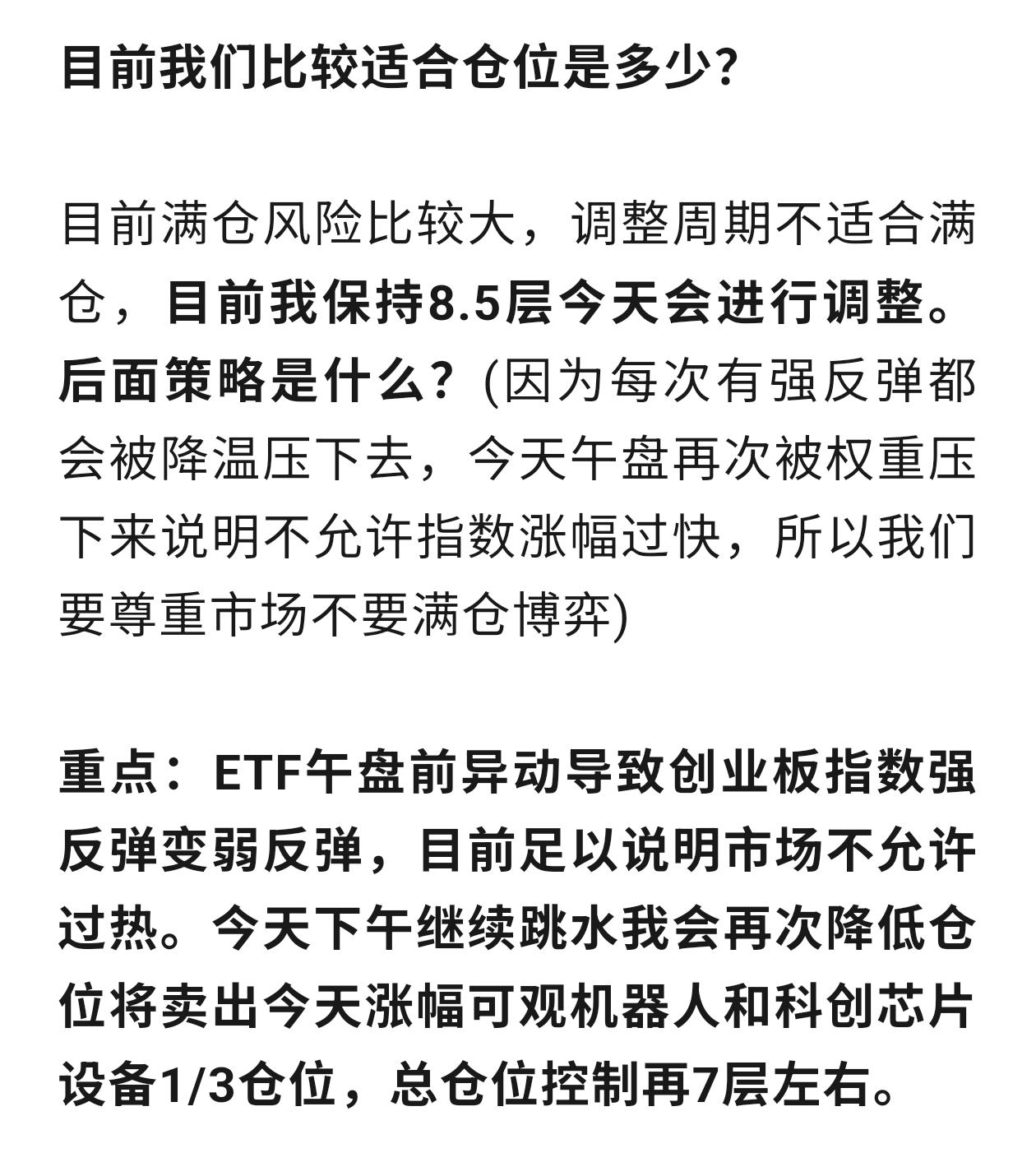 收盘总结:1月下旬以来每次动作都是降低仓位,从12月启动前买在启动底部区域后1月下旬逐步出掉人工智能(CPO概念)降低8.5层,11.21高位减仓1/3降低机器人、科创芯片和半导体设备总仓位降低7层左右。上周五再次降低鹏华军工(航天概念)1/2仓位,目前总仓位6.5层。甚至有不少朋友仓位已经降低到5层左右,那么面对今天调整我们可以坦然面对我们高位已经锁定利润。 今天调整幅度还是比较大,对于上周追涨买入高位加仓朋友非常不友好,但是对于我们有子弹是机会大于风险。(图片是3次长篇文章降低仓位内容) 今天创业板指数早盘冲高会一路回落,从上周我已多次提前风险并提前降低仓位。今天要不要出手买入?本次调整下来买入机会在哪里? 宽基指数基金有哪些特点